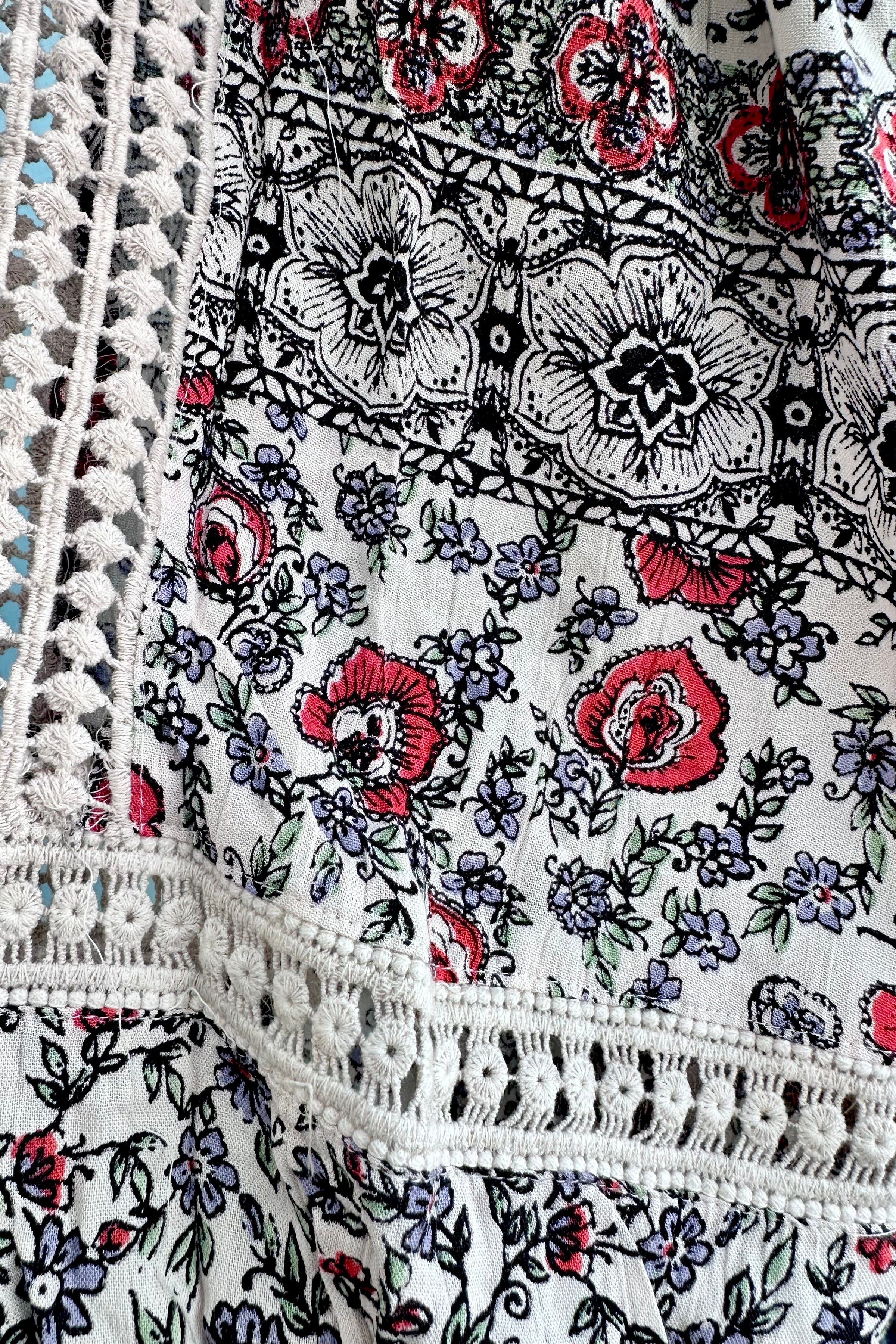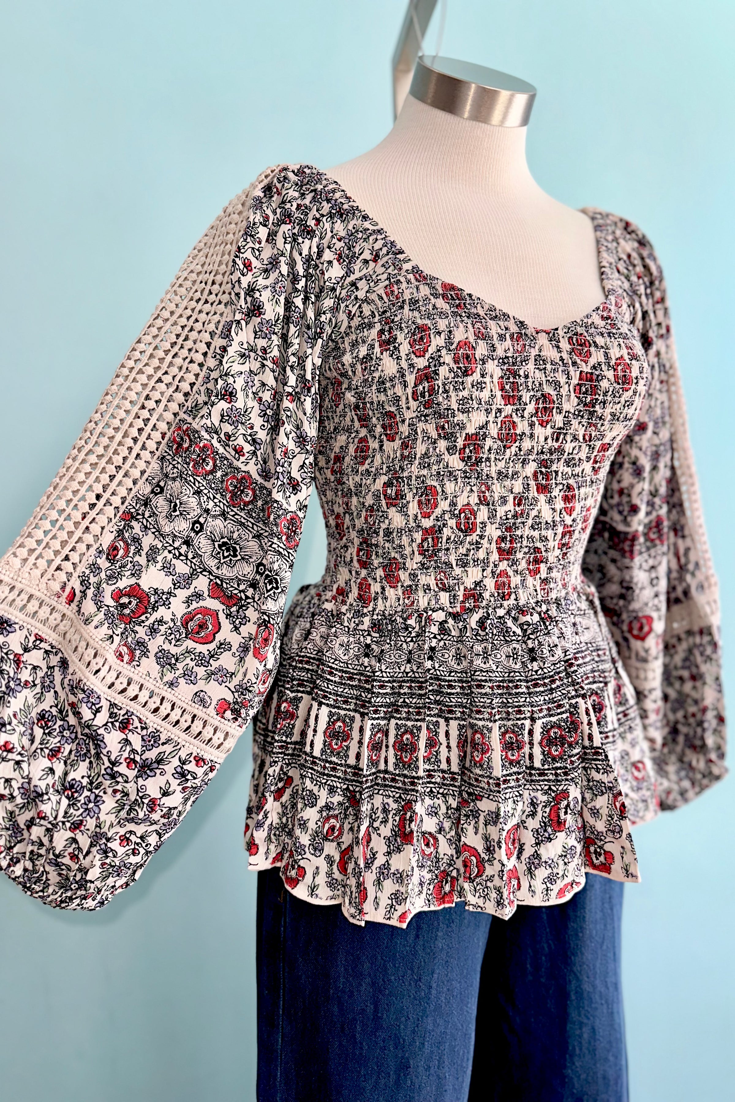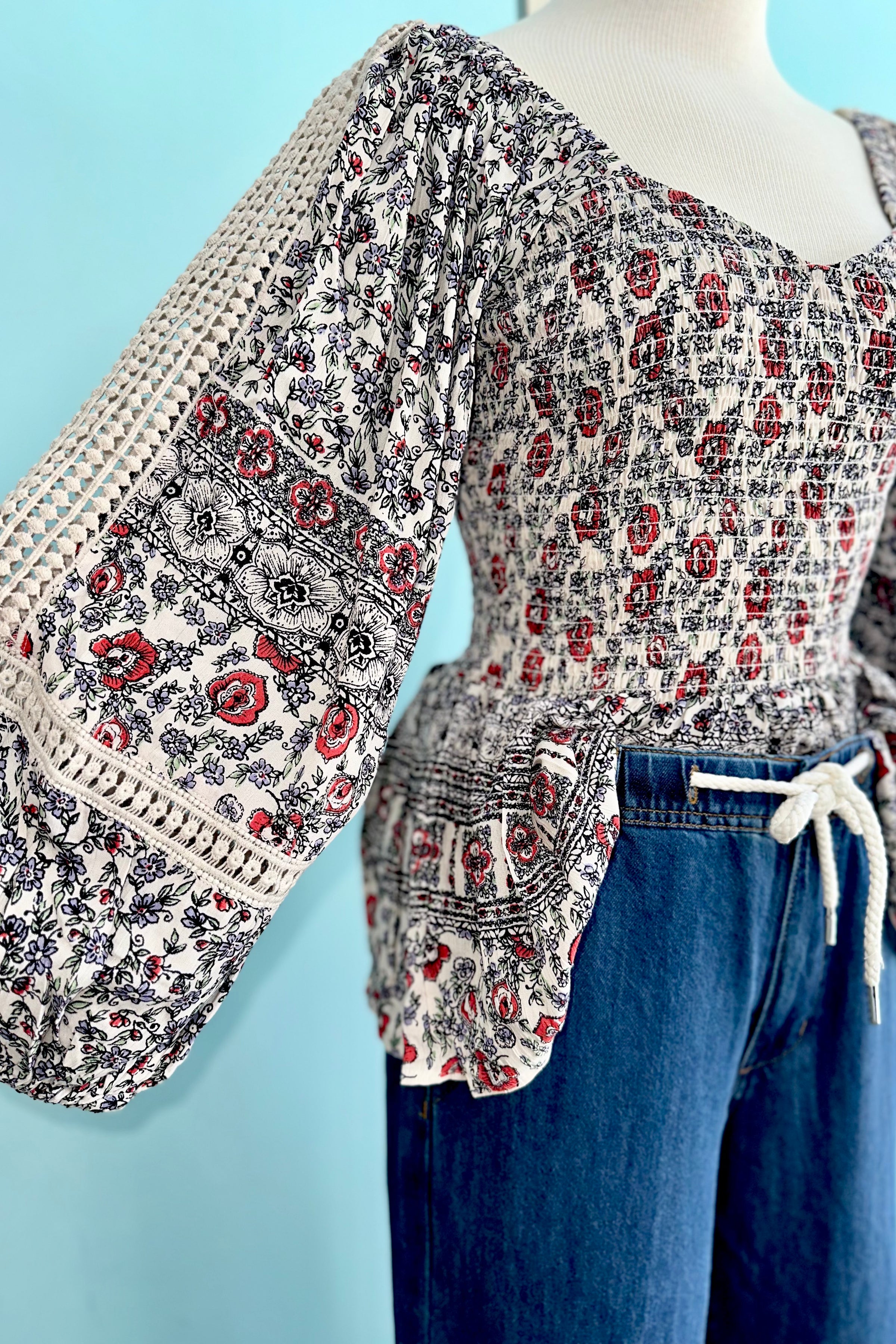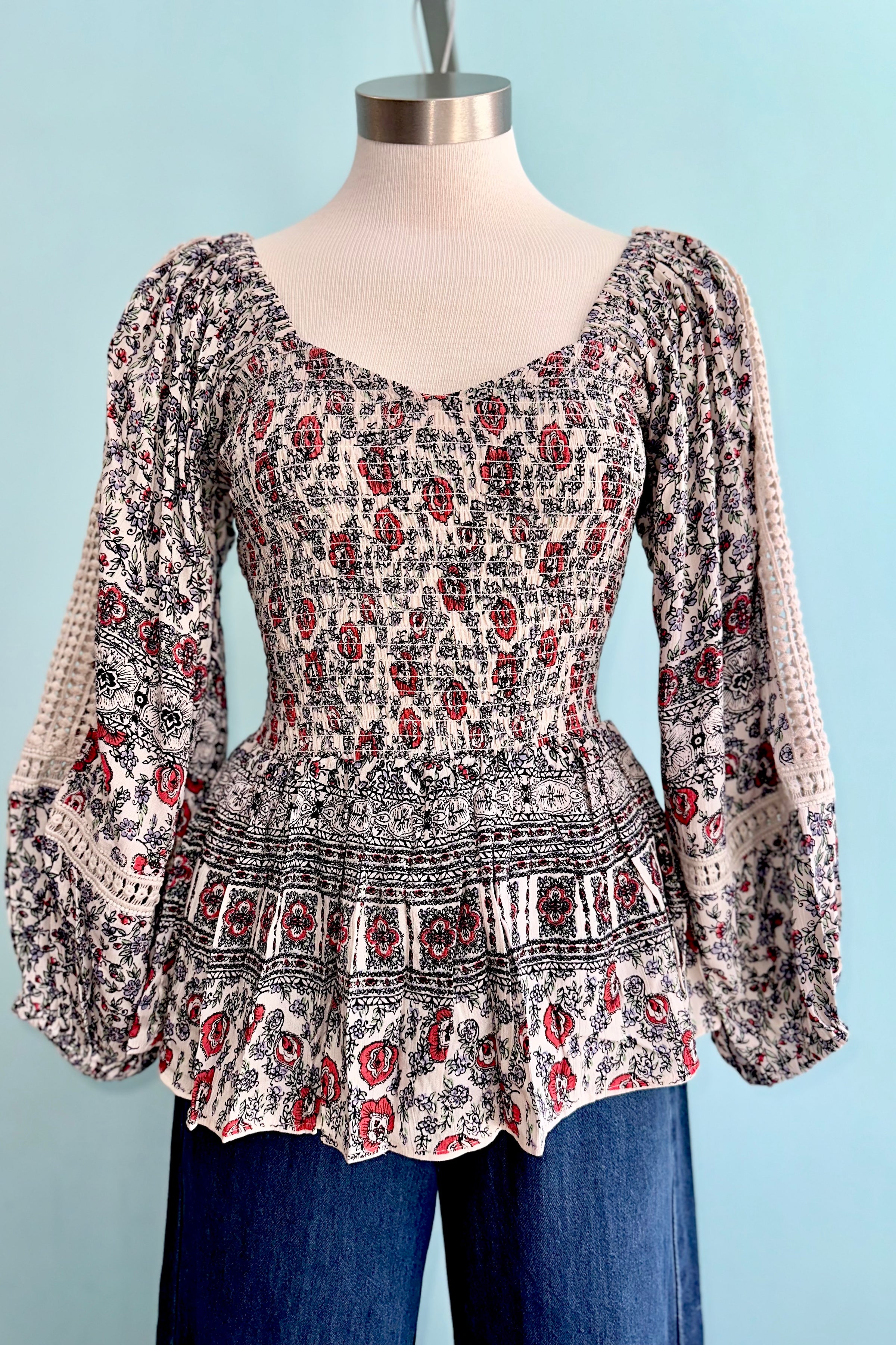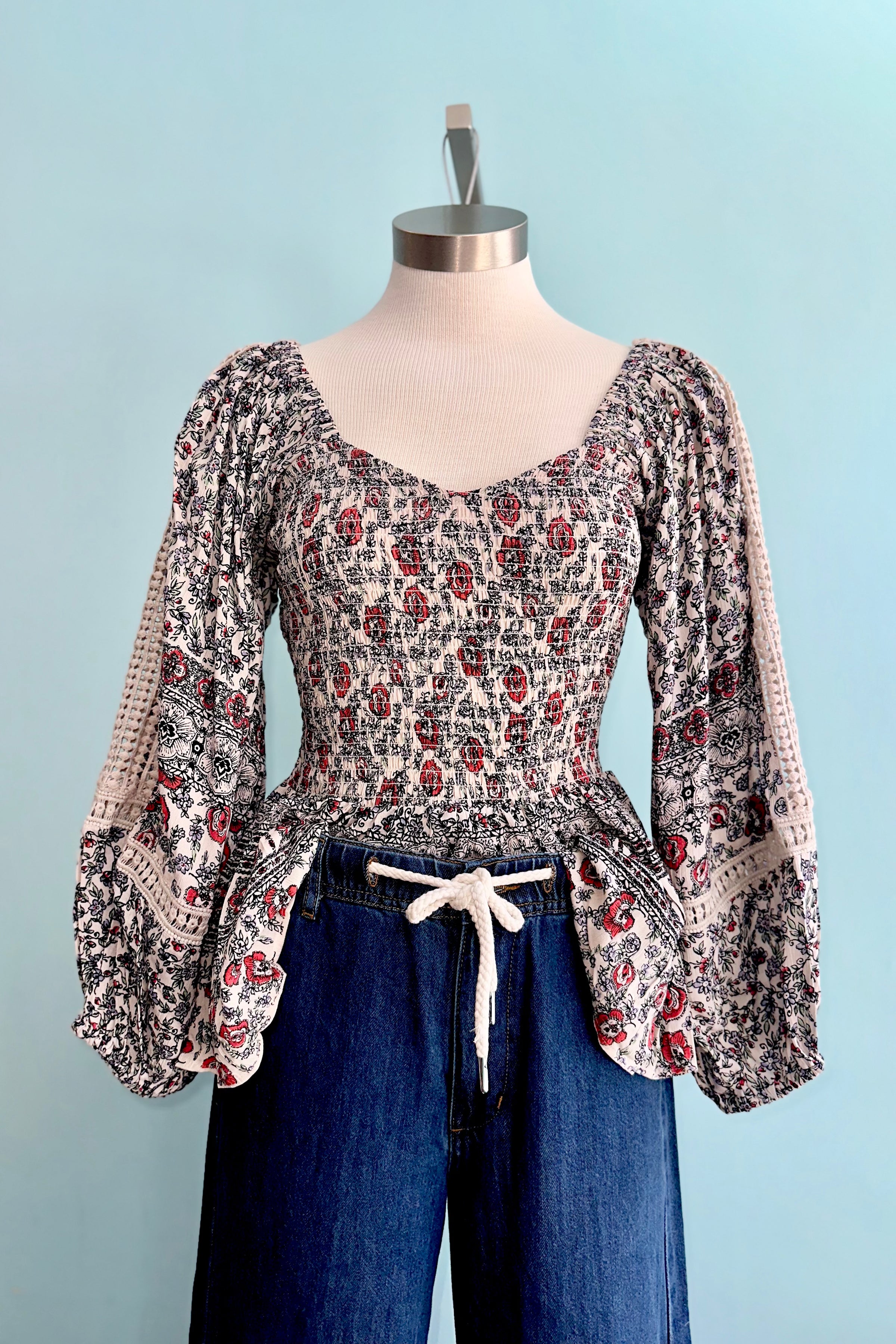 Poet sleeve top in white with black with red detail and a fully smocked bodice. This top has long poet sleeves with a crochet lace cut out. The front has a sweetheart neckline and a square back.