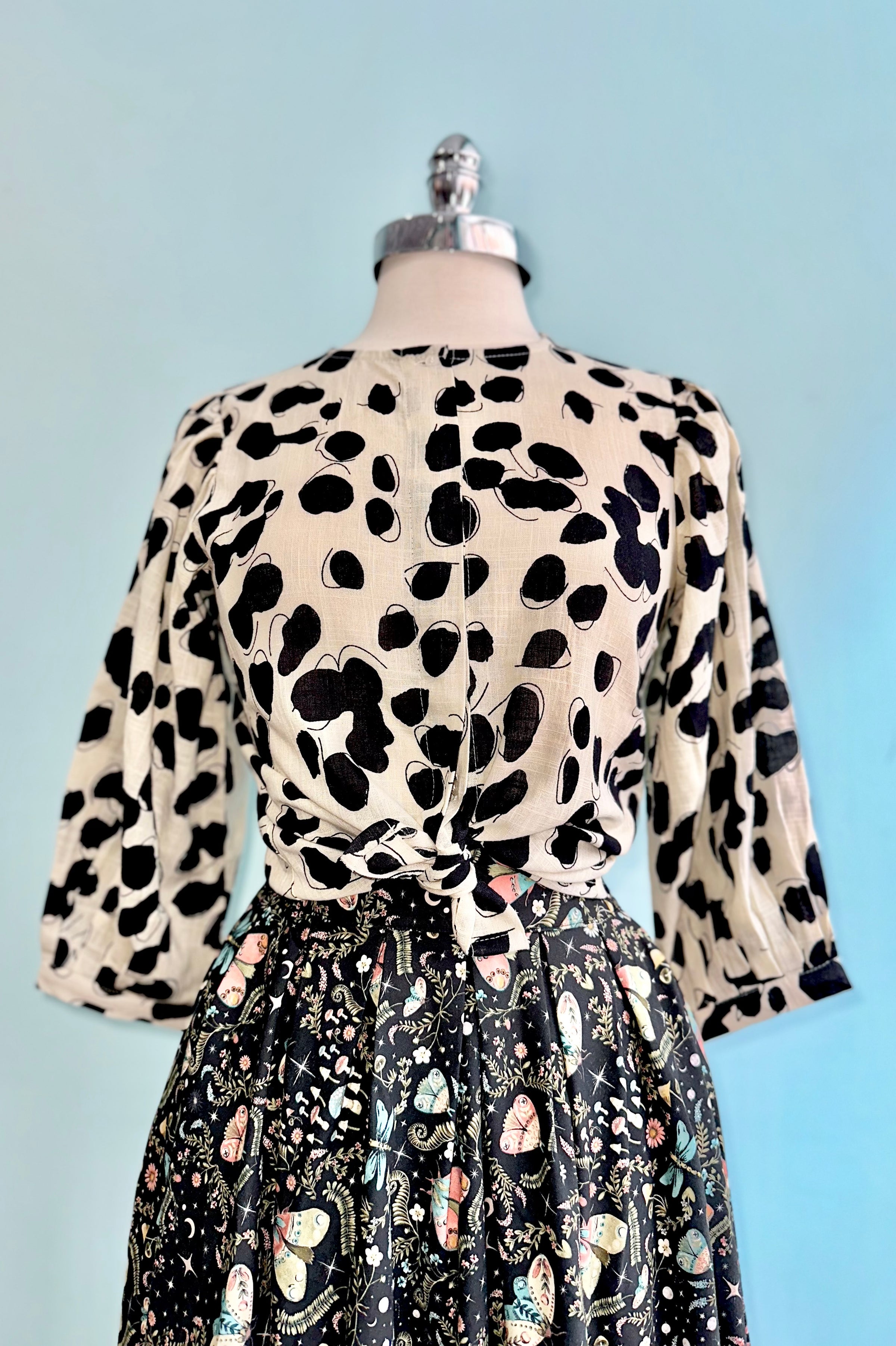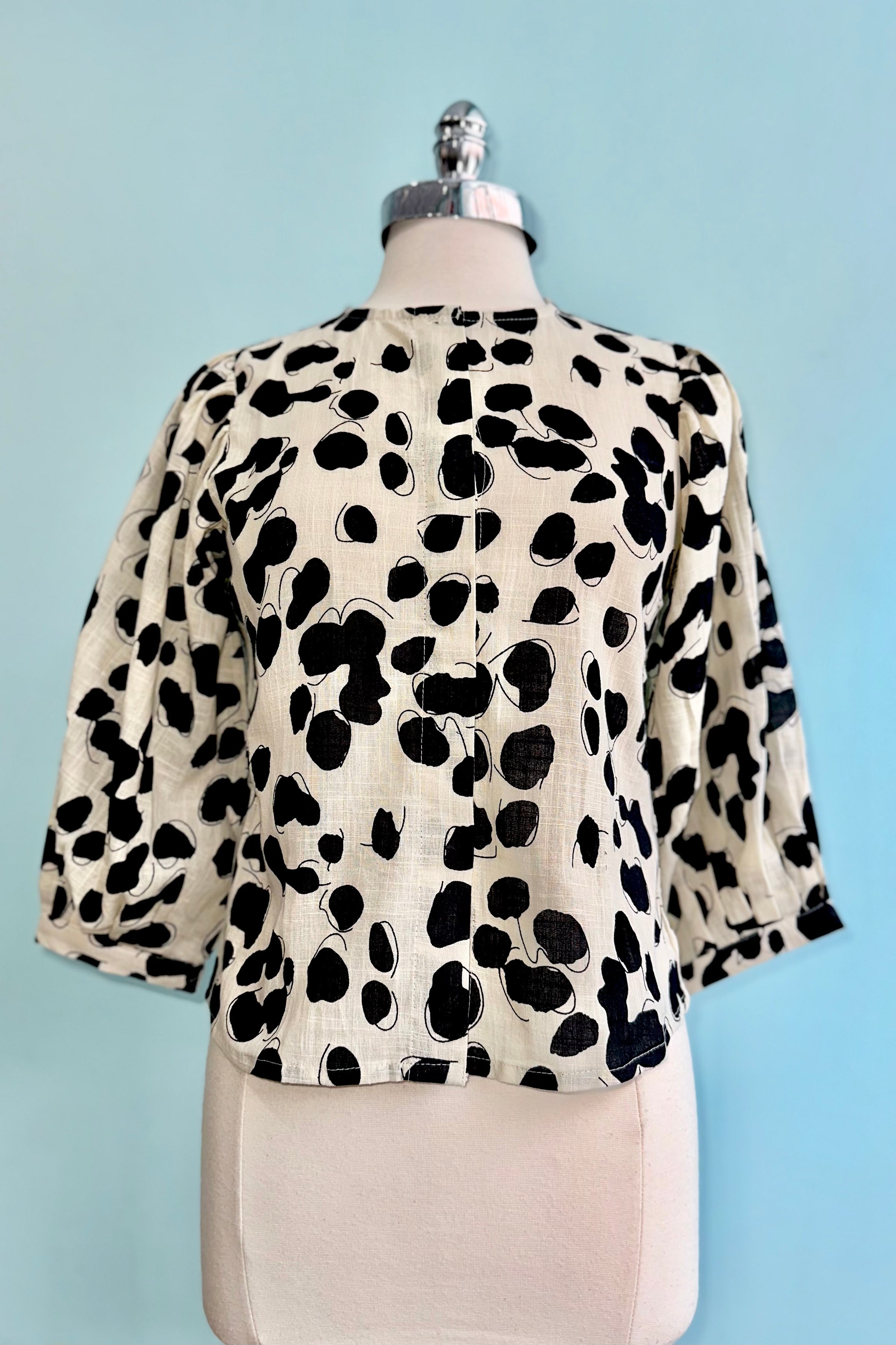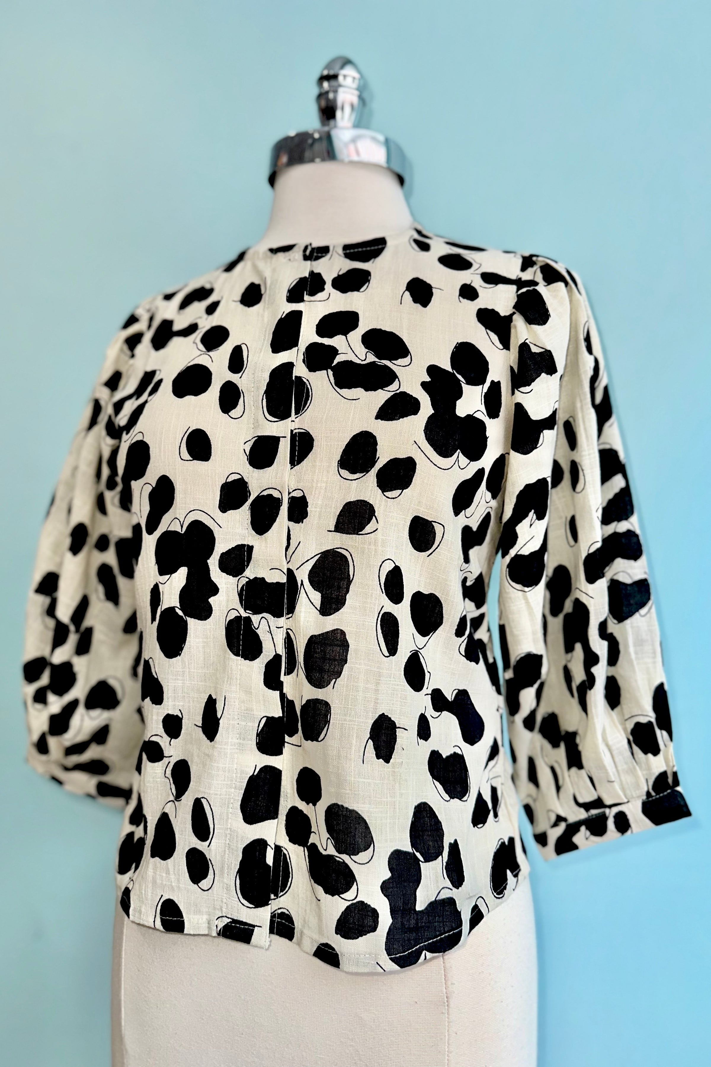 A cream cotton shirt with a black dalmatian print. This top has a round neck, slightly puffed 3/4 sleeves, and a concealed button front closure.