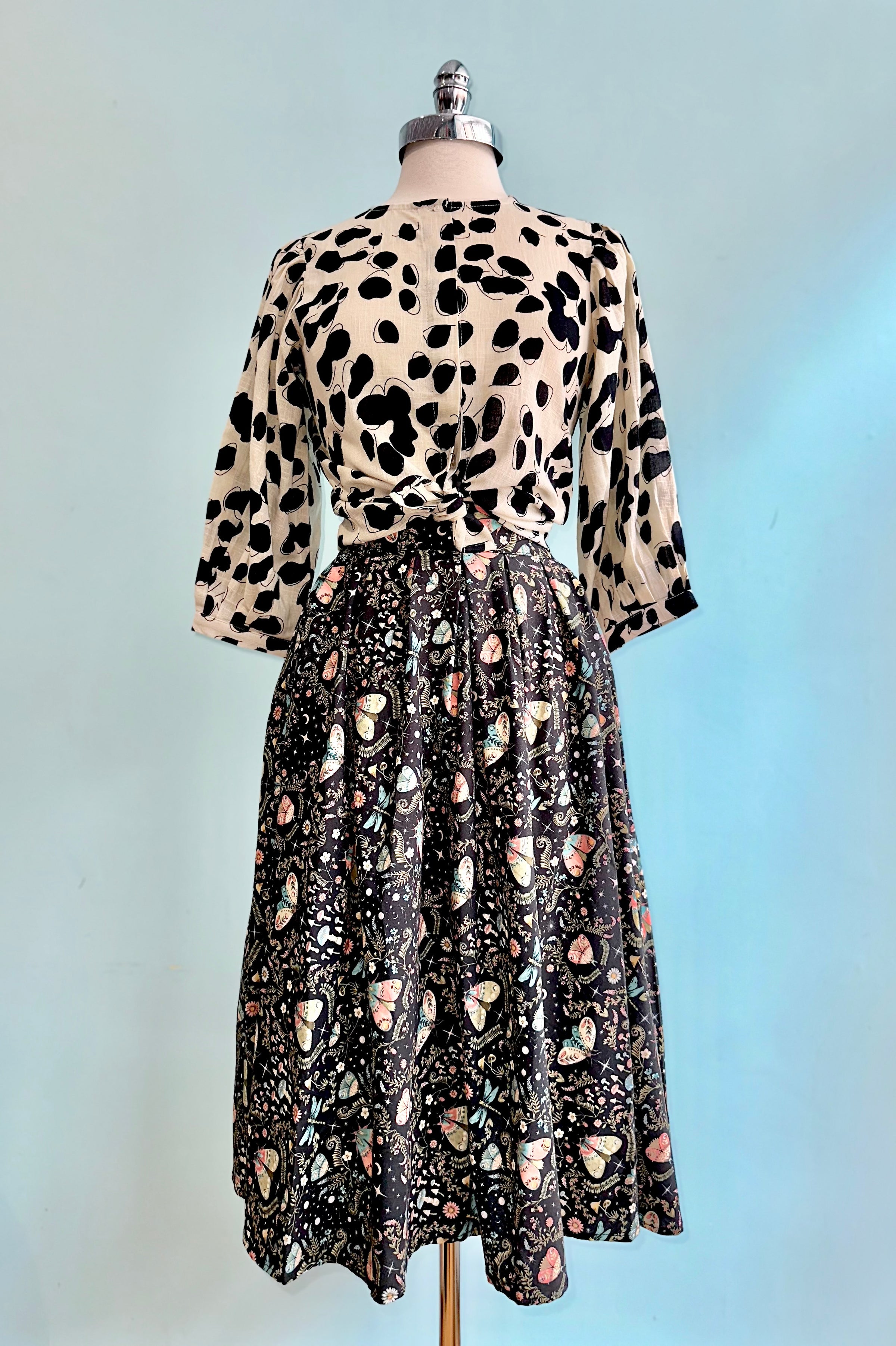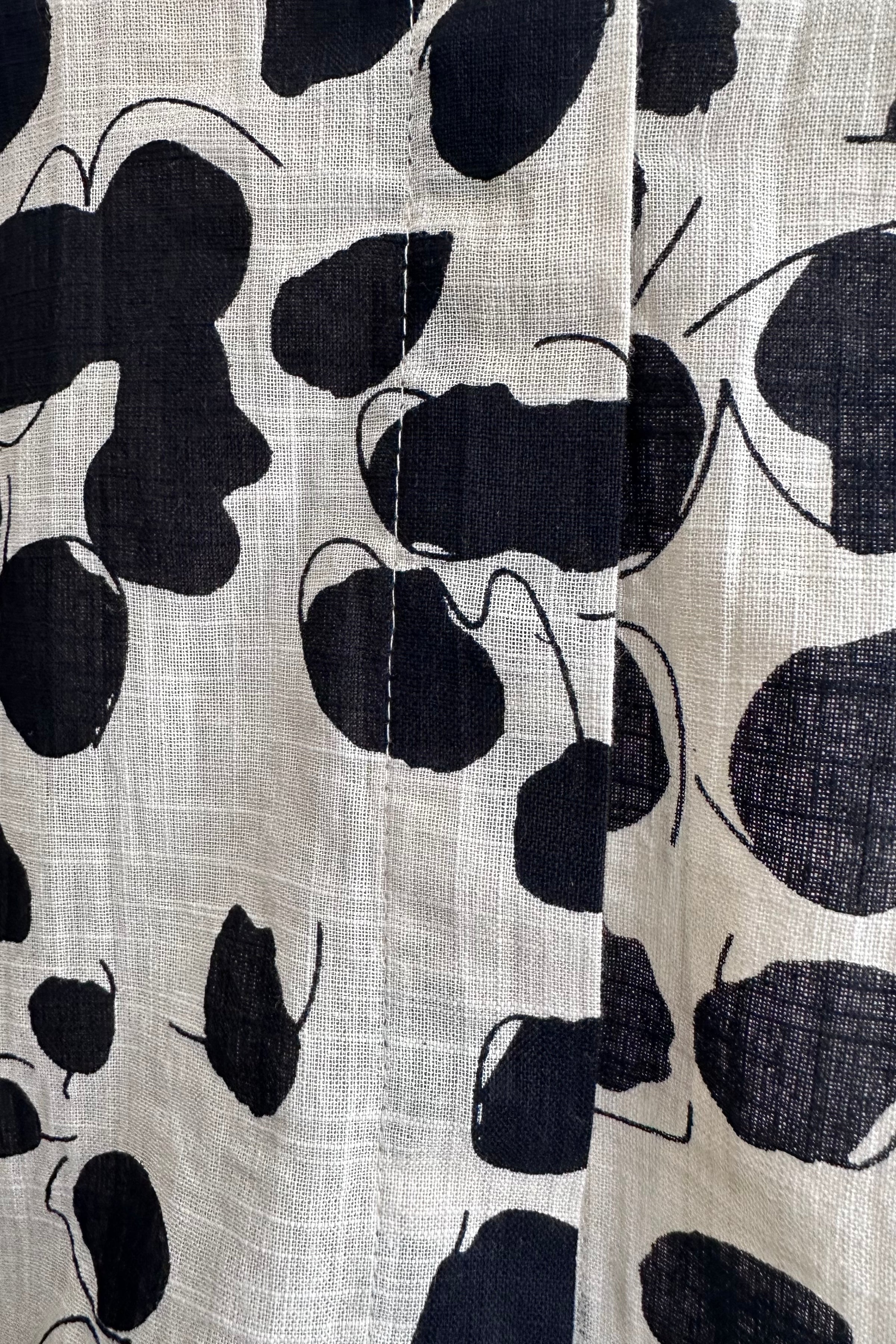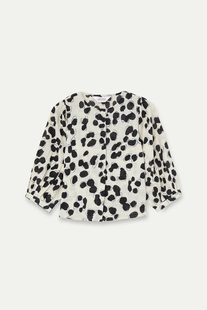 A cream cotton shirt with a black dalmatian print. This top has a round neck, slightly puffed 3/4 sleeves, and a concealed button front closure.