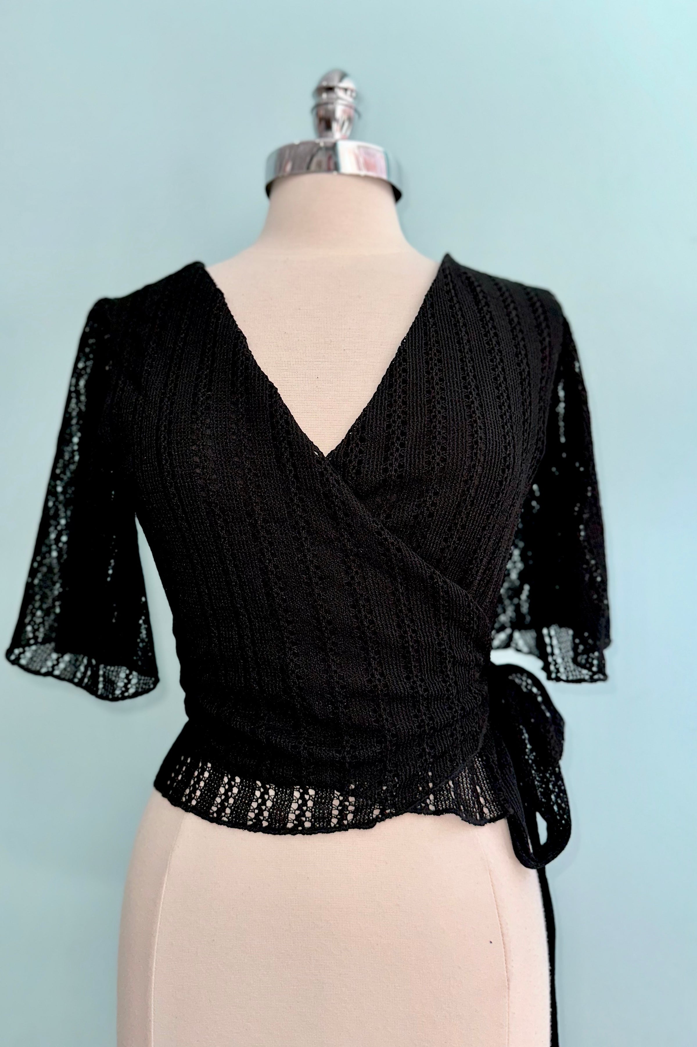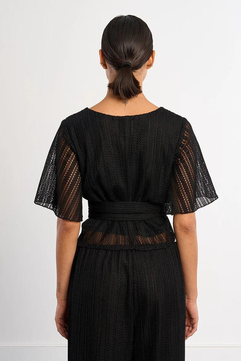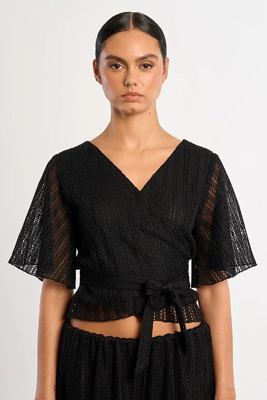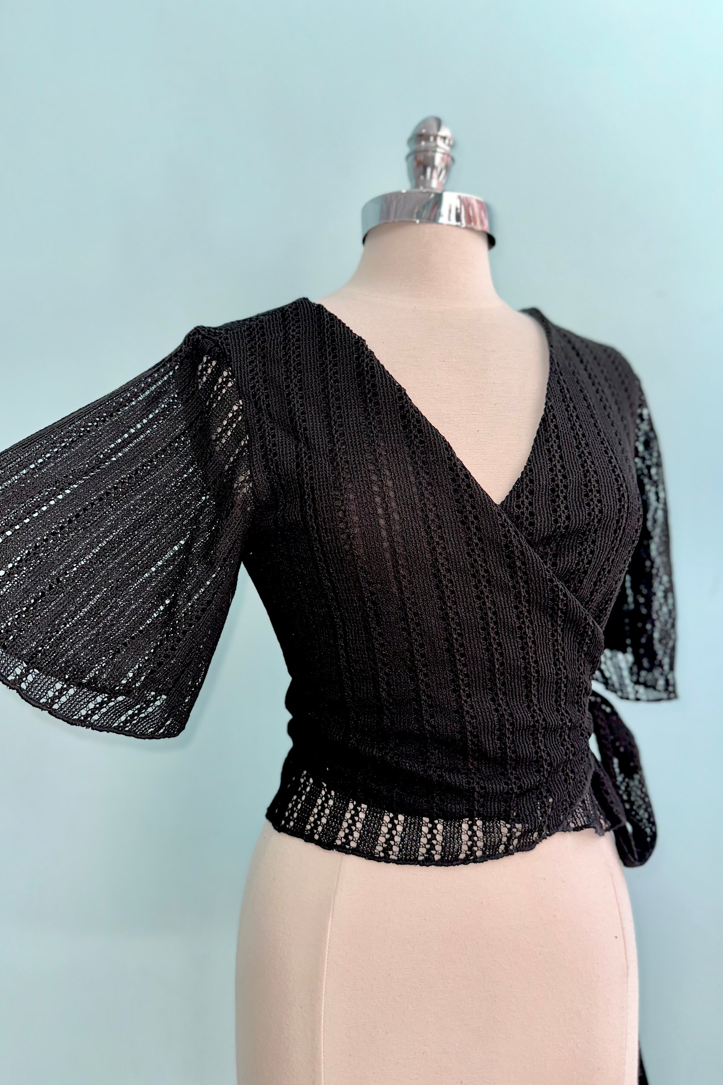 Black openwork wrap top with flutter sleeves. This is a true wrap with ties to fasten and a surplice neckline. This top is lined in the bodice with semi-sheer sleeves and has a good amount of stretch. We recommend going with your usual size.
