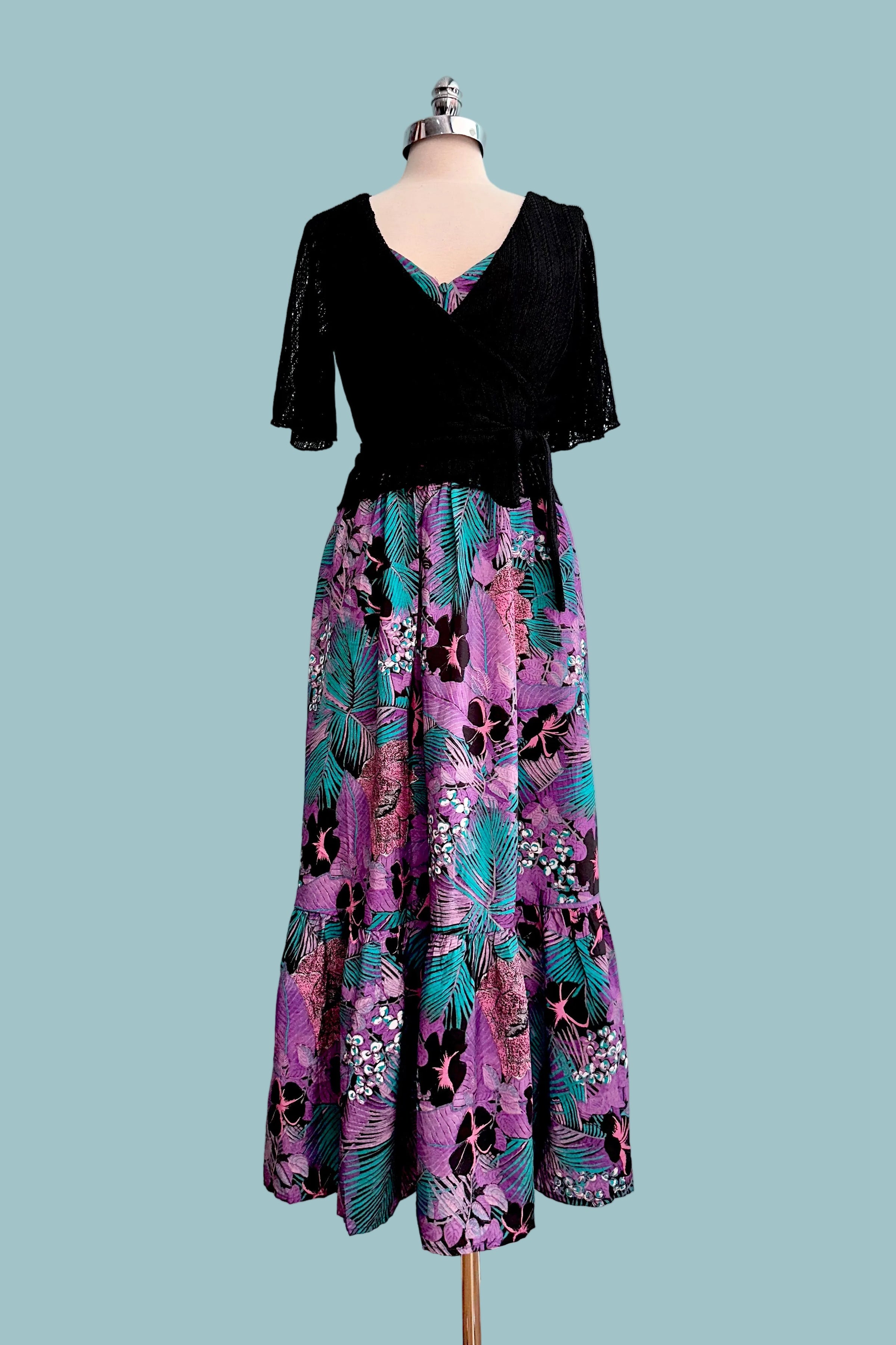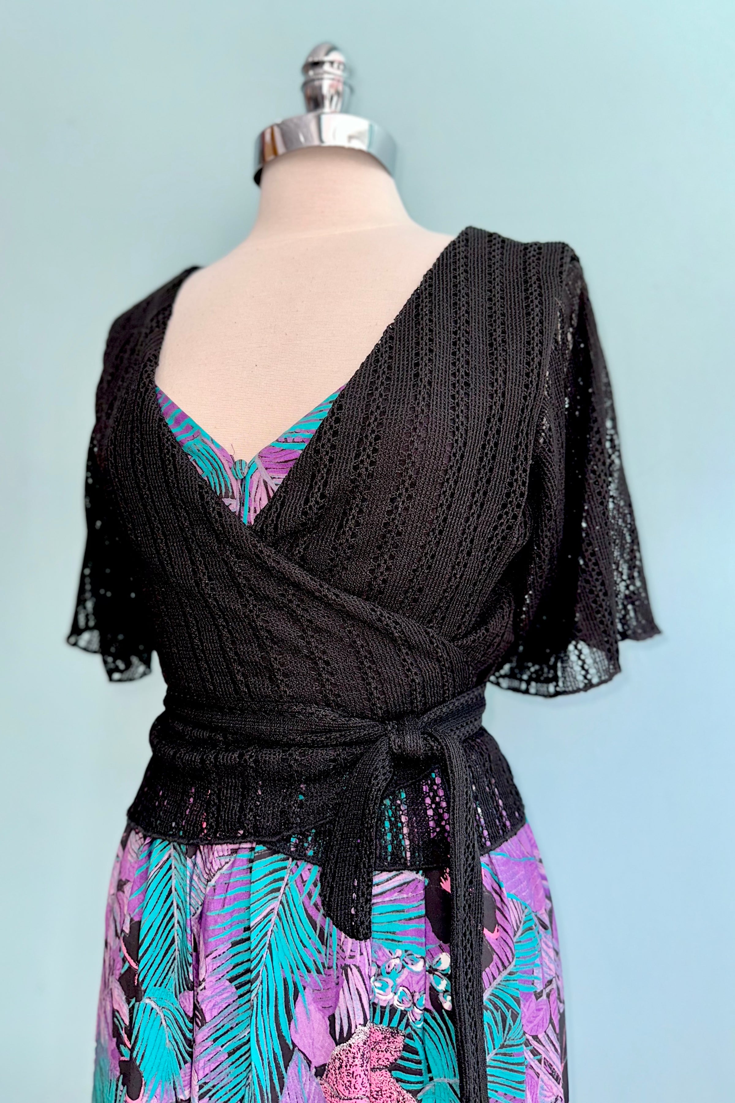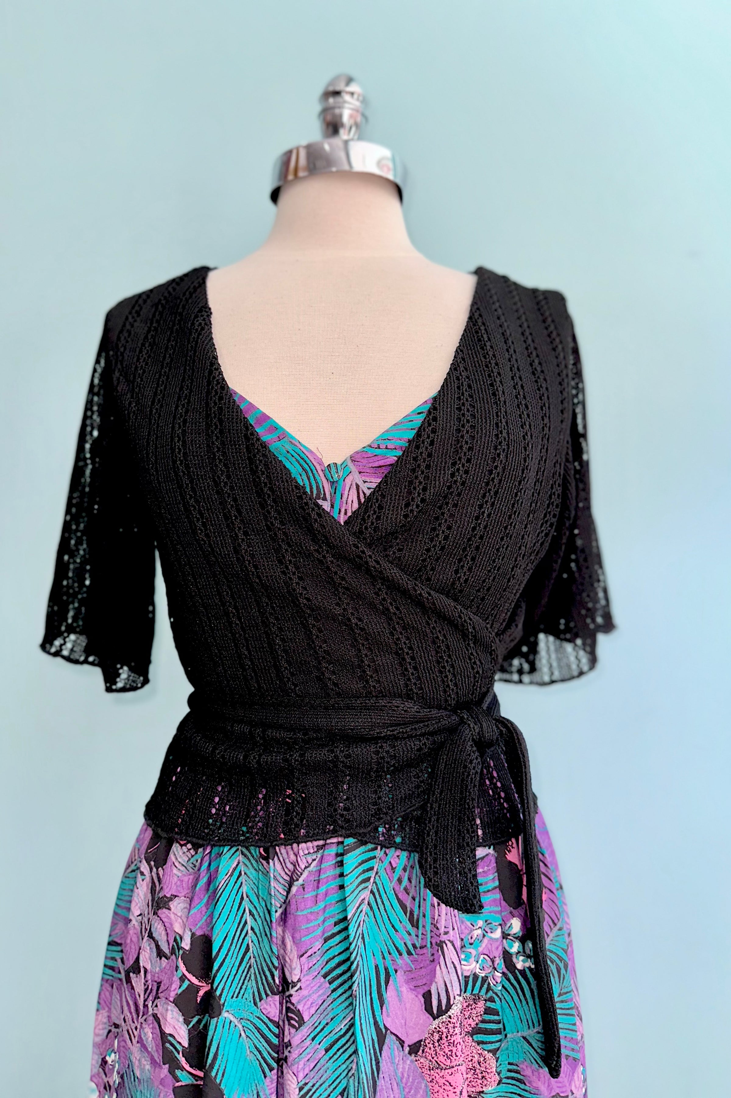 Black openwork wrap top with flutter sleeves. This is a true wrap with ties to fasten and a surplice neckline. This top is lined in the bodice with semi-sheer sleeves and has a good amount of stretch. We recommend going with your usual size.