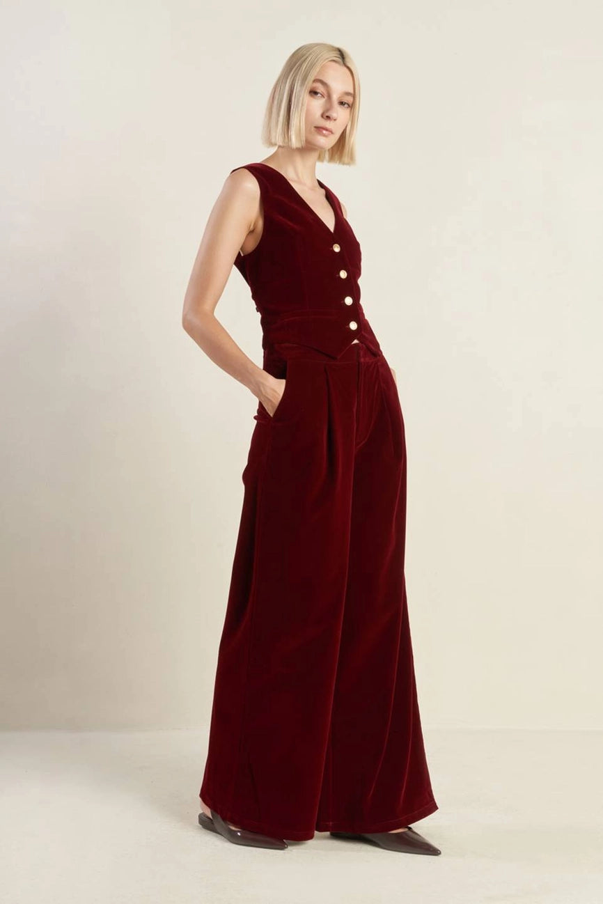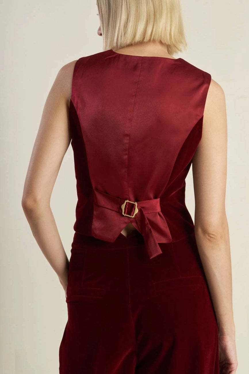 Burgundy velvet vest with a gold button front. This vest is lined and backed in satin.