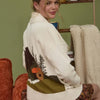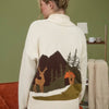 V-neckline cardigan sweater with a shawl collar and a toggle front.  This sweater has long sleeves and a dropped shouldered relaxed fit as well as pockets!  The back has a camp scene mountains, a cabin and an antlered deer!