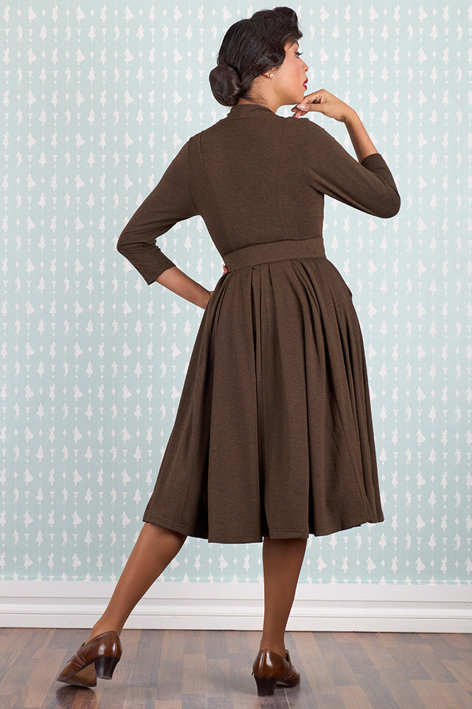 Stretch dress with an asymmetrical buttoned bodice and a full skirt. Featuring a flattering V-neckline, decorative front buttons, and gentle gathers at the shoulders for subtle elegance. A matching belt defines the waist, while the full swing skirt with hidden pockets adds both charm and practicality.