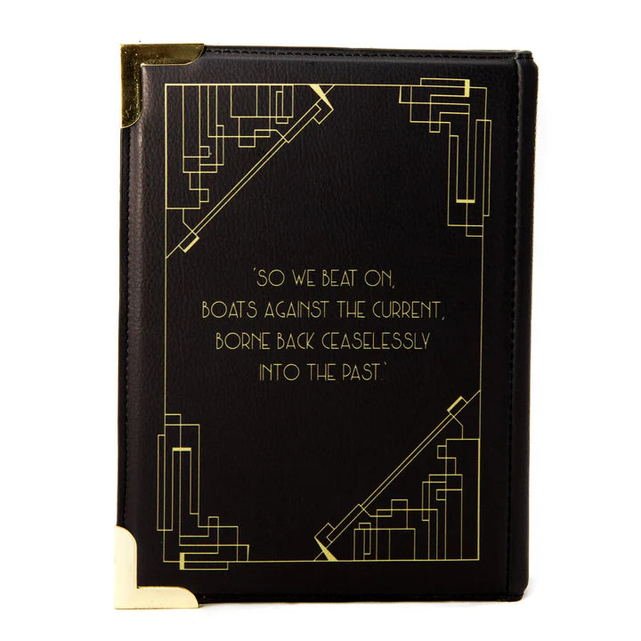 Celebrate your passion for F. Scott Fitzgerald's cherished novel, The Great Gatsby, with this beautifully crafted faux leather handbag. It features a stylish black and gold art deco design, harking back to the glamour of the 1920s. The iconic quote is inscribed on the back of the purse: ‘So we beat on, boats against the current, borne back ceaselessly into the past.’