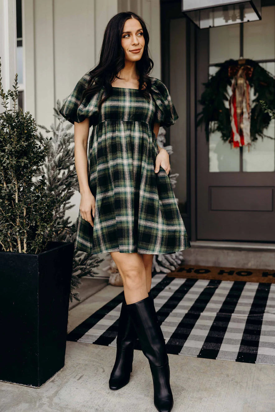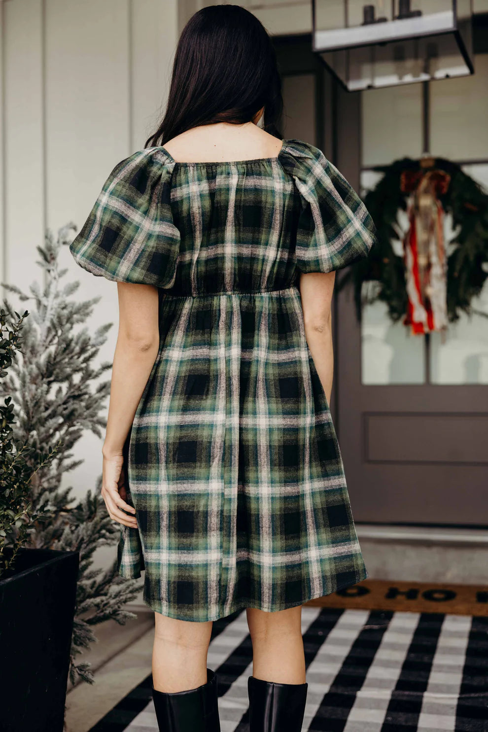 Green plaid mini dress with big dolman balloon sleeves and an elastic empire back waist. This dress is made of a soft lightweight flannel. The front bodice and skirt are lined. This is about knee length and has side pockets.