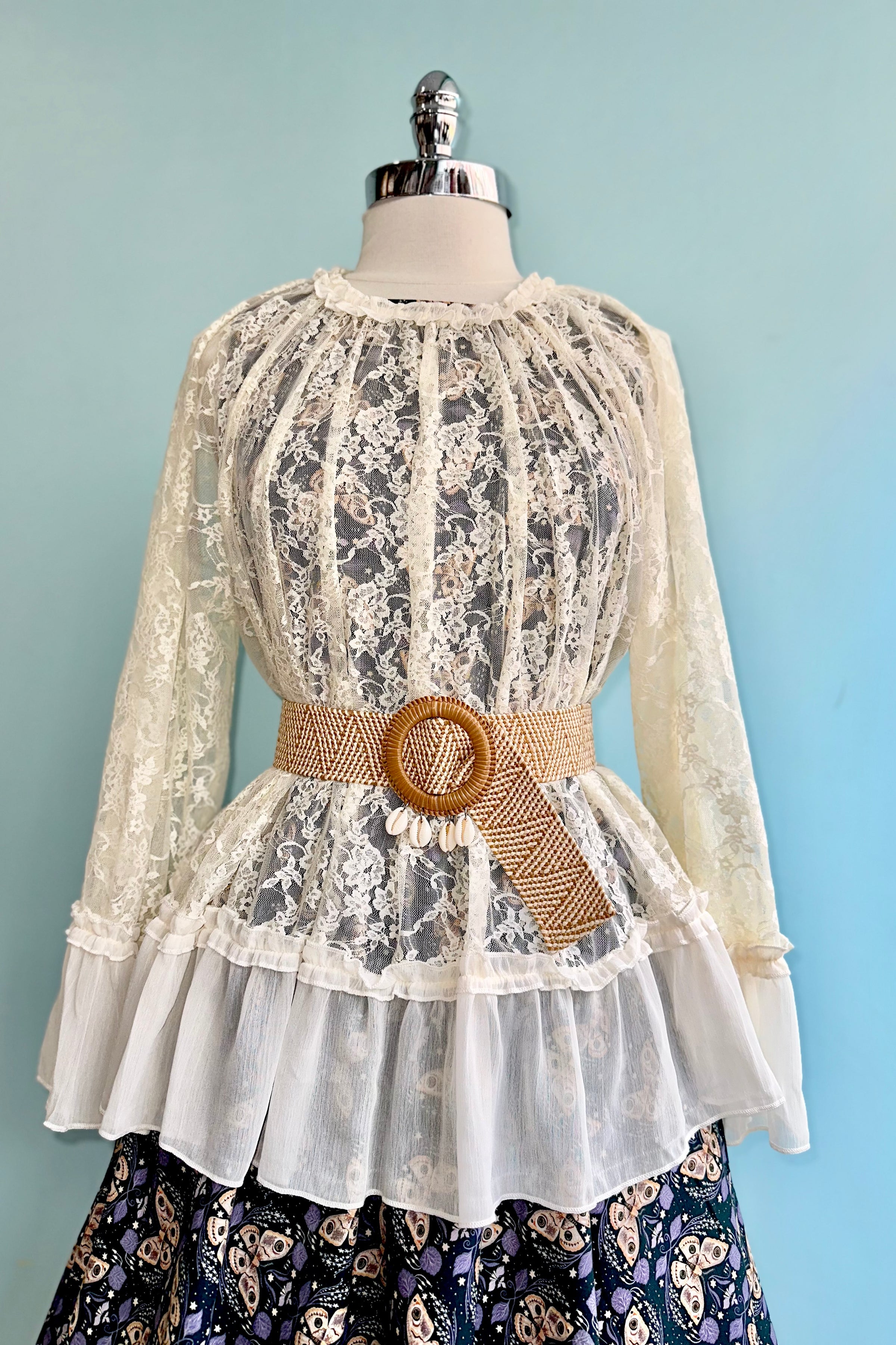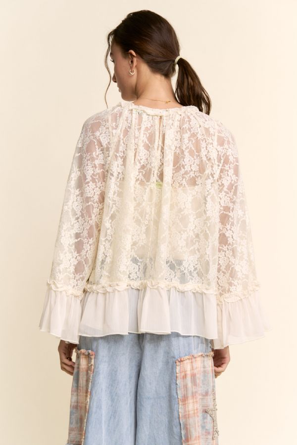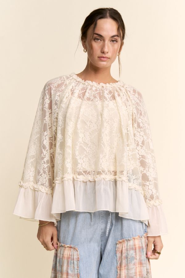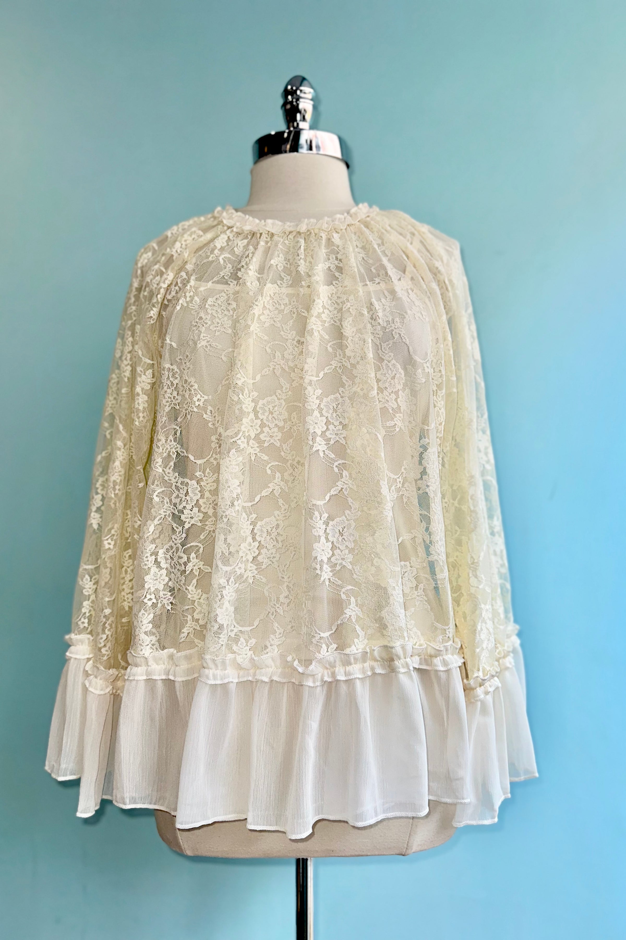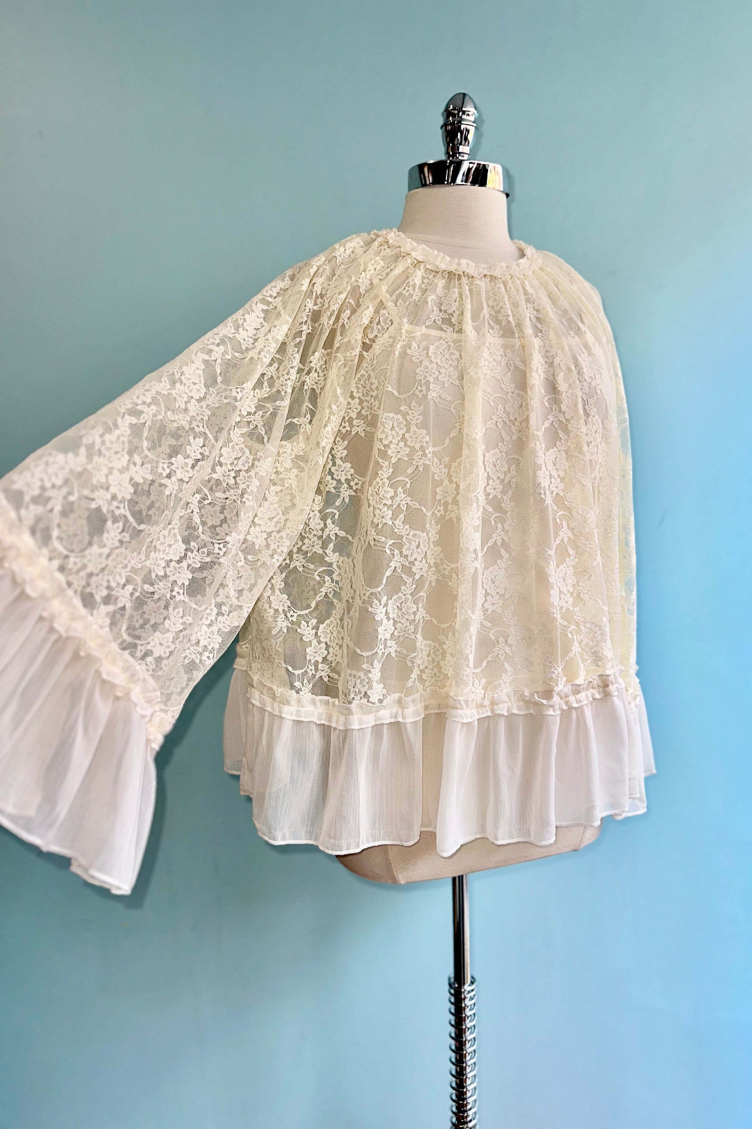 A sheer lace top in ivory with a ruffled hem and cuff.  This top is loose fitting and oversized with long bell sleeves. There is a fitted attached tank top as a lining.