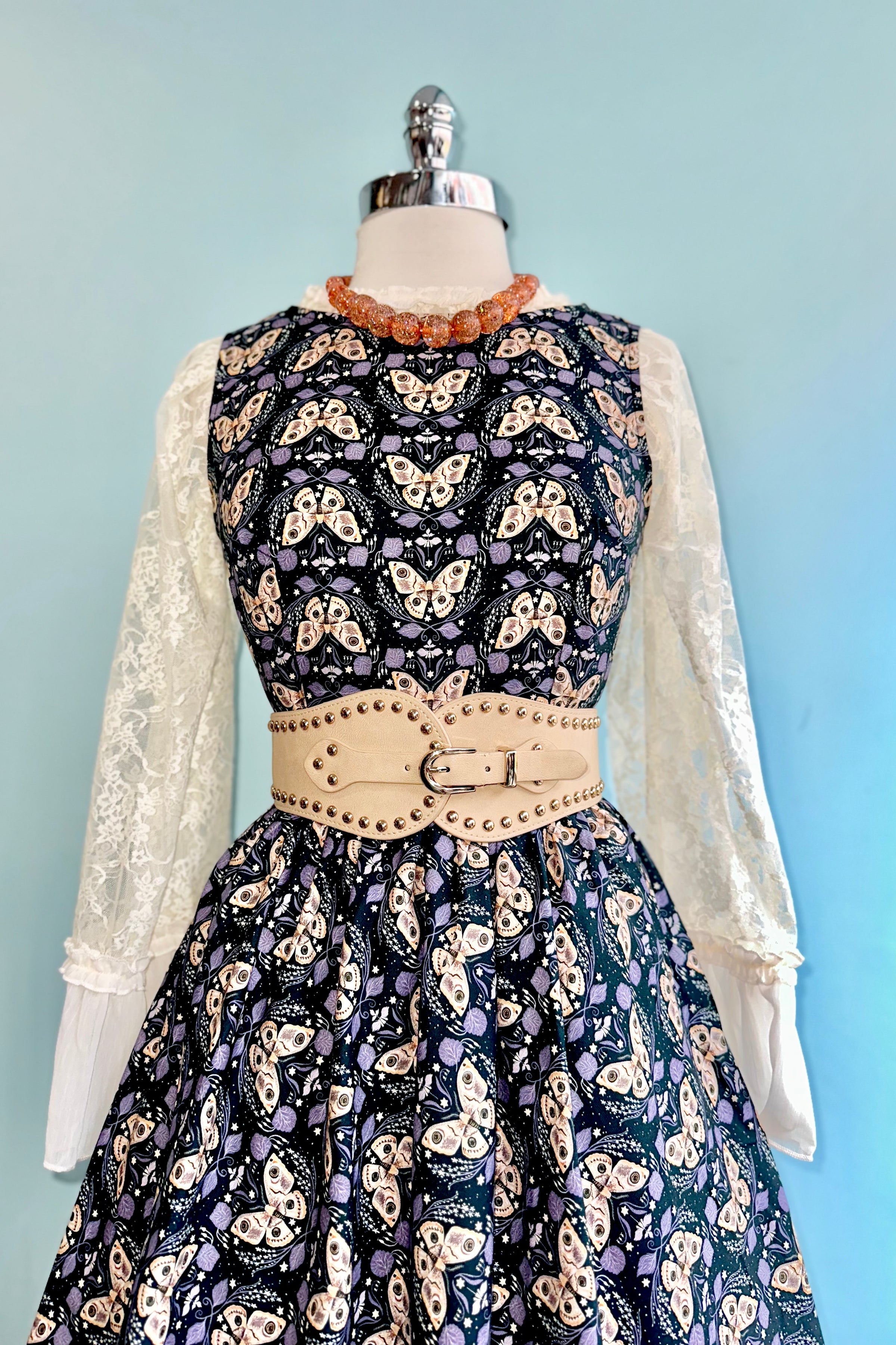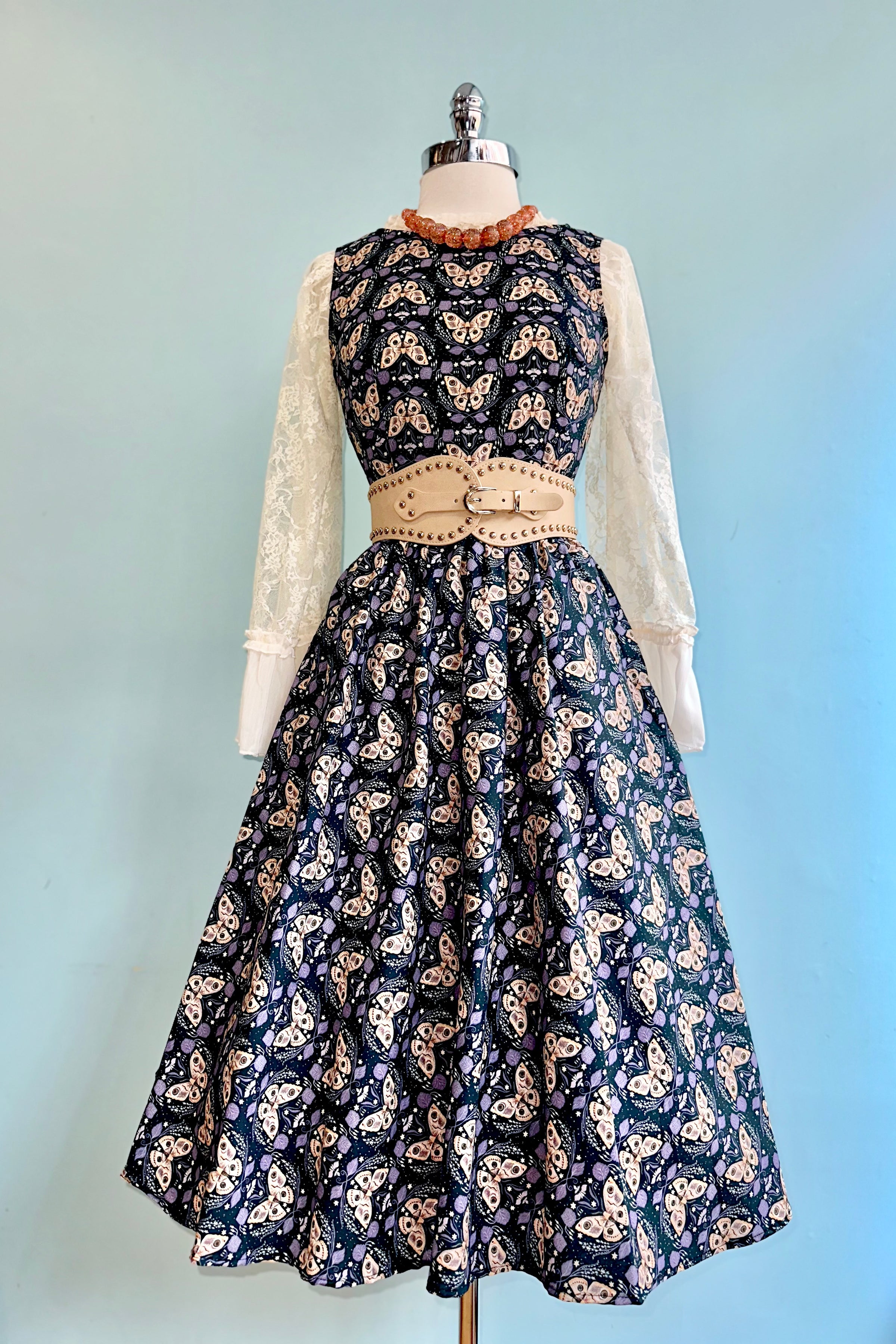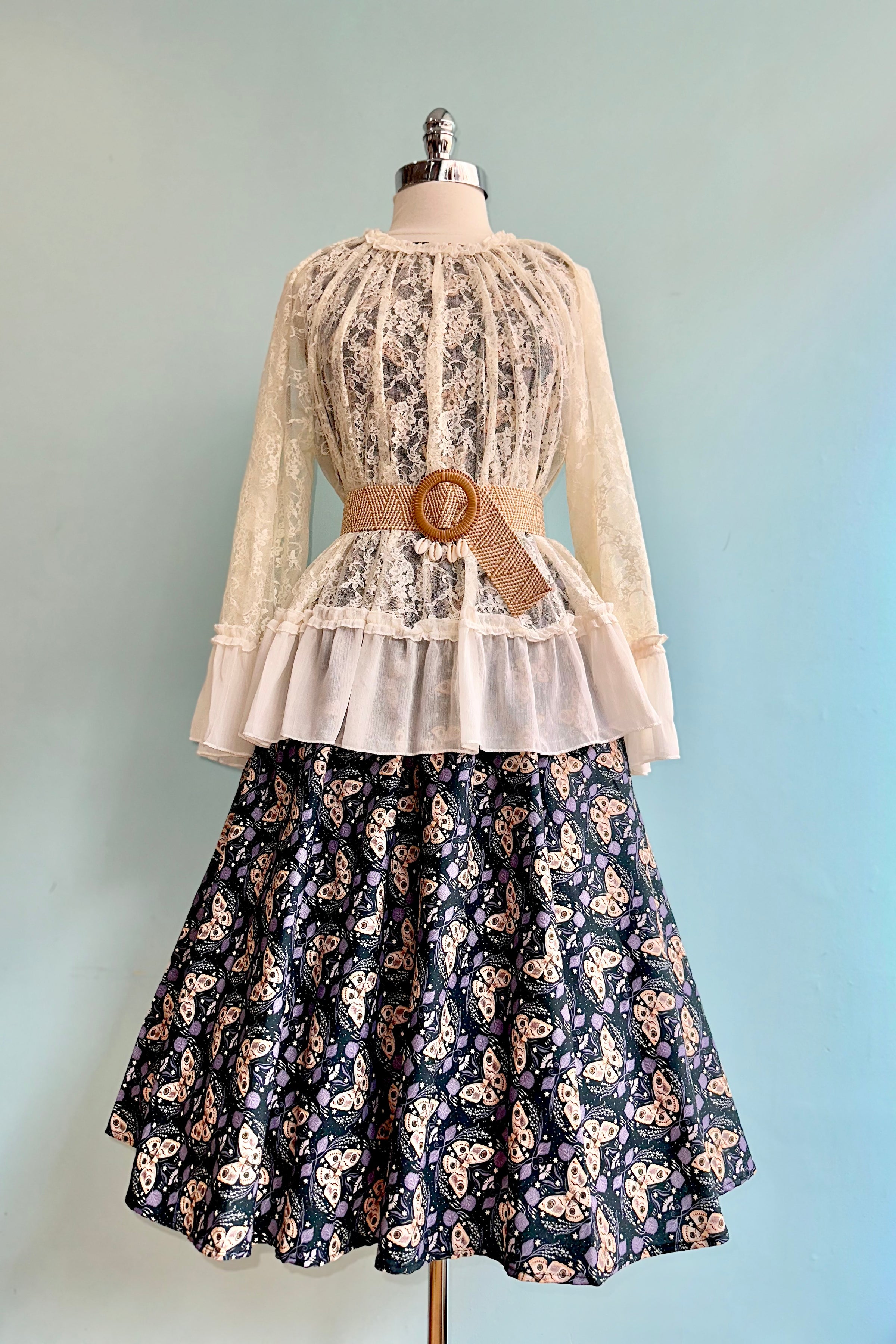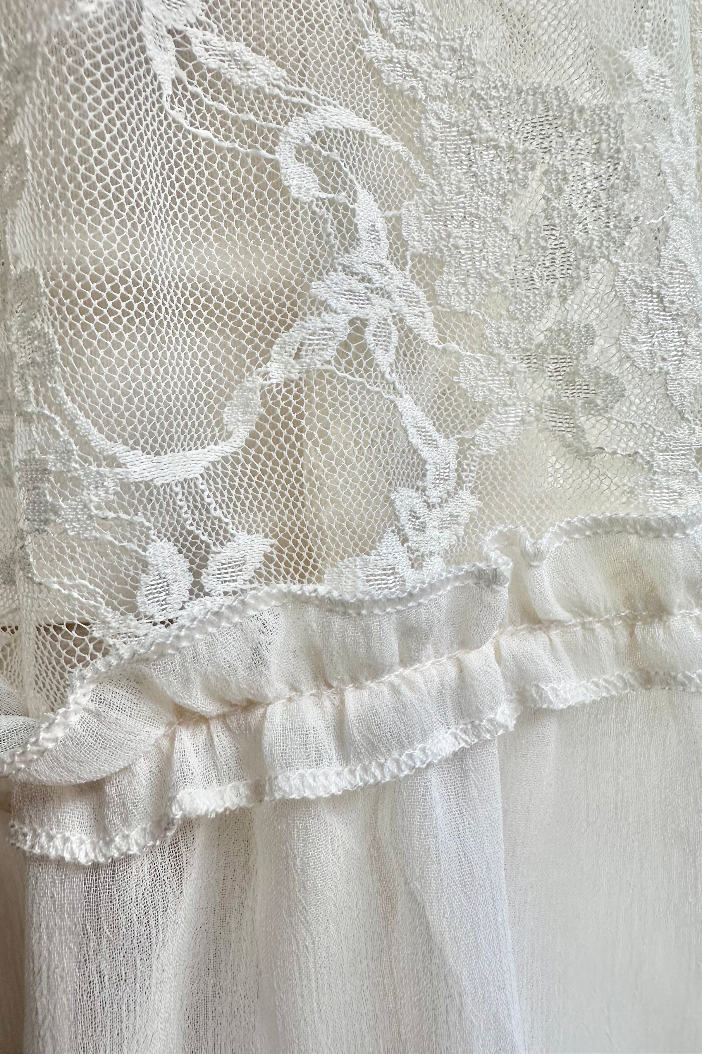 A sheer lace top in ivory with a ruffled hem and cuff.  This top is loose fitting and oversized with long bell sleeves. There is a fitted attached tank top as a lining.