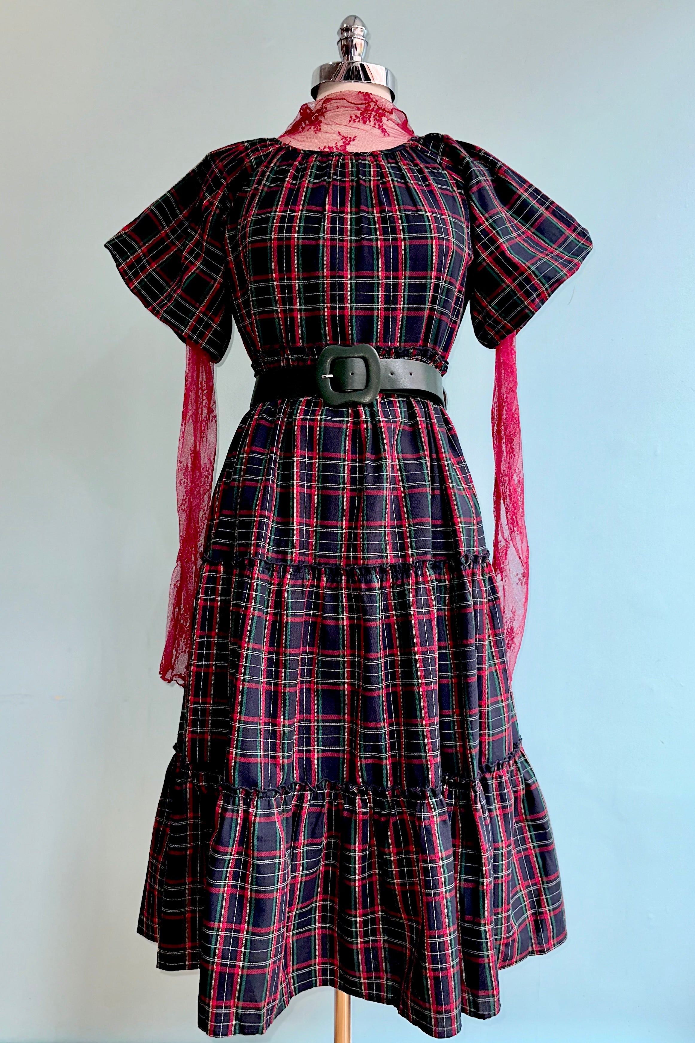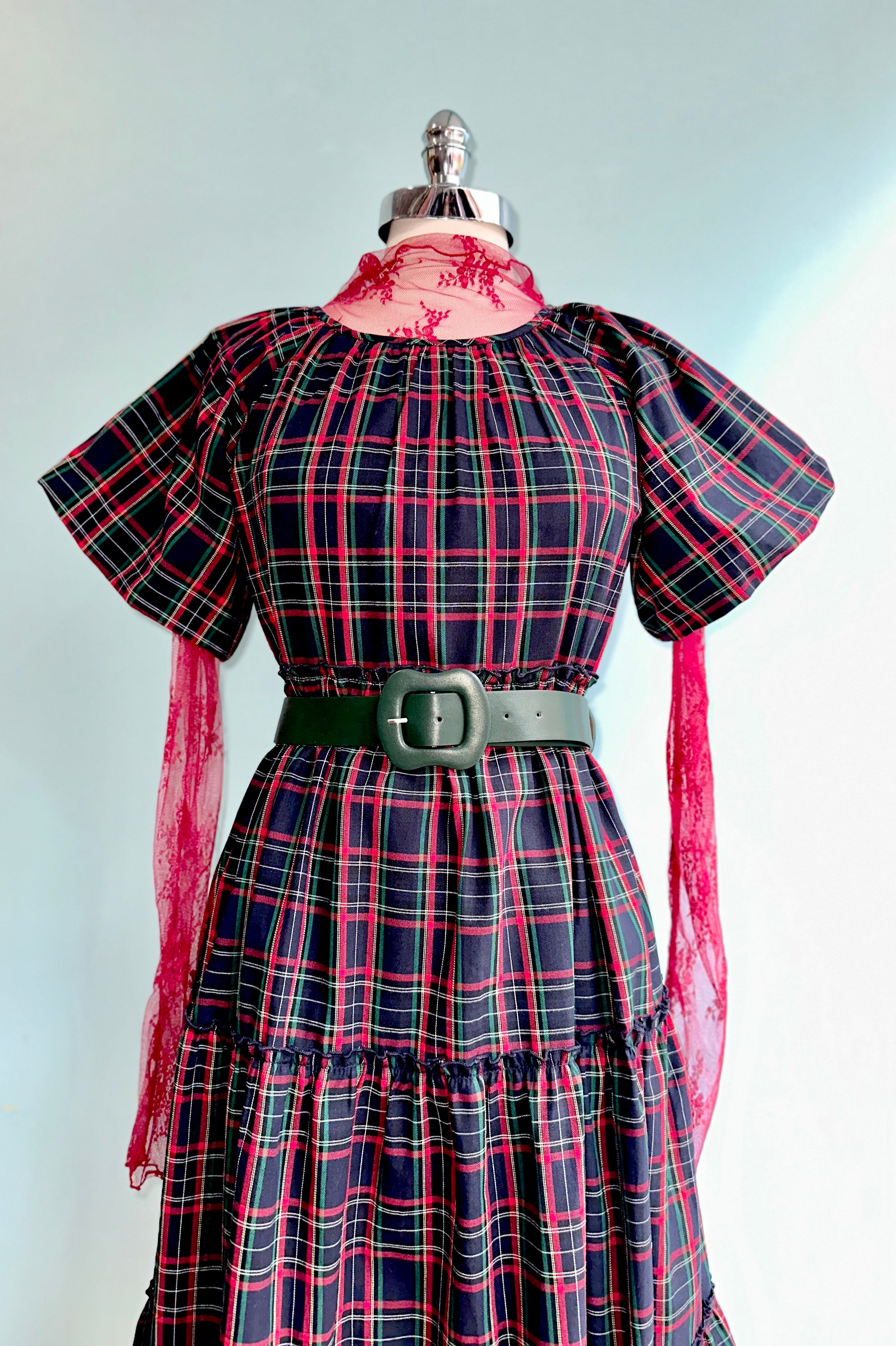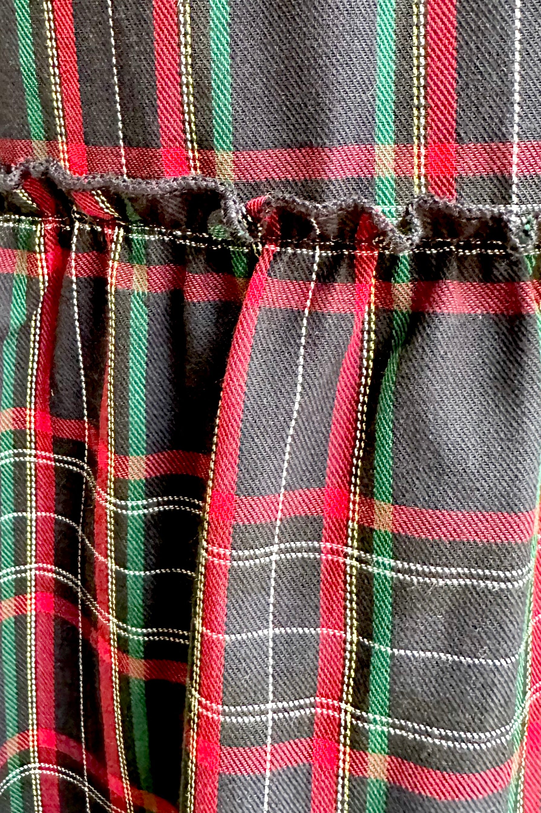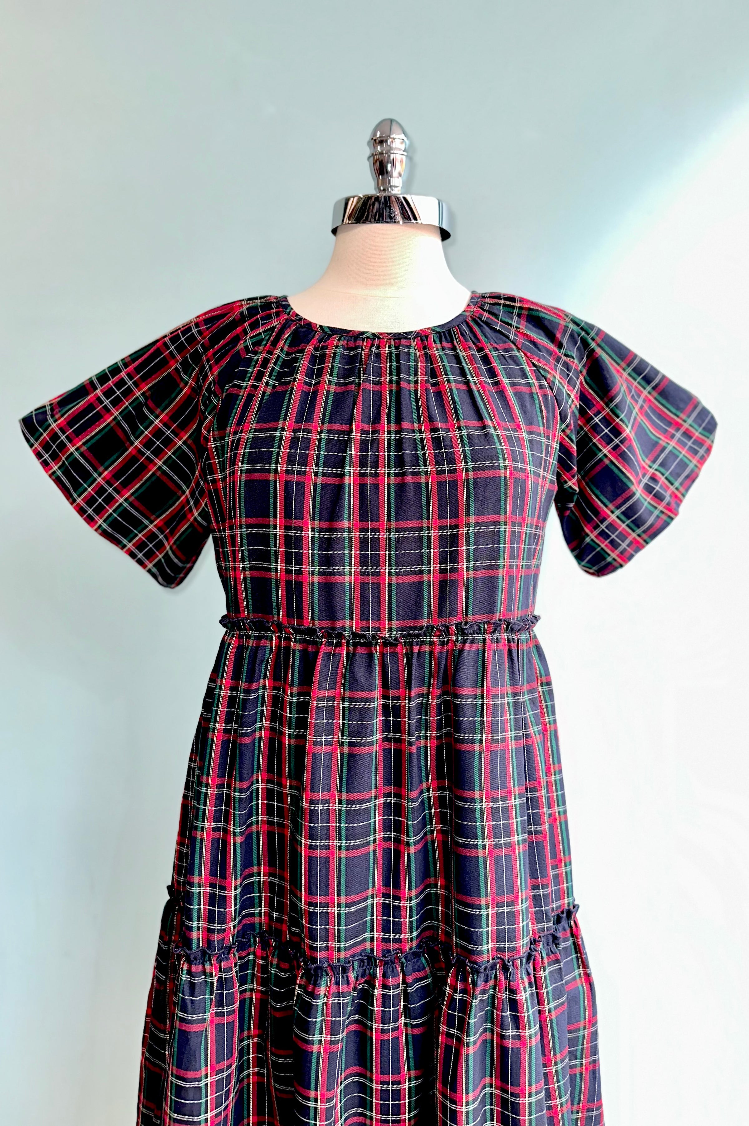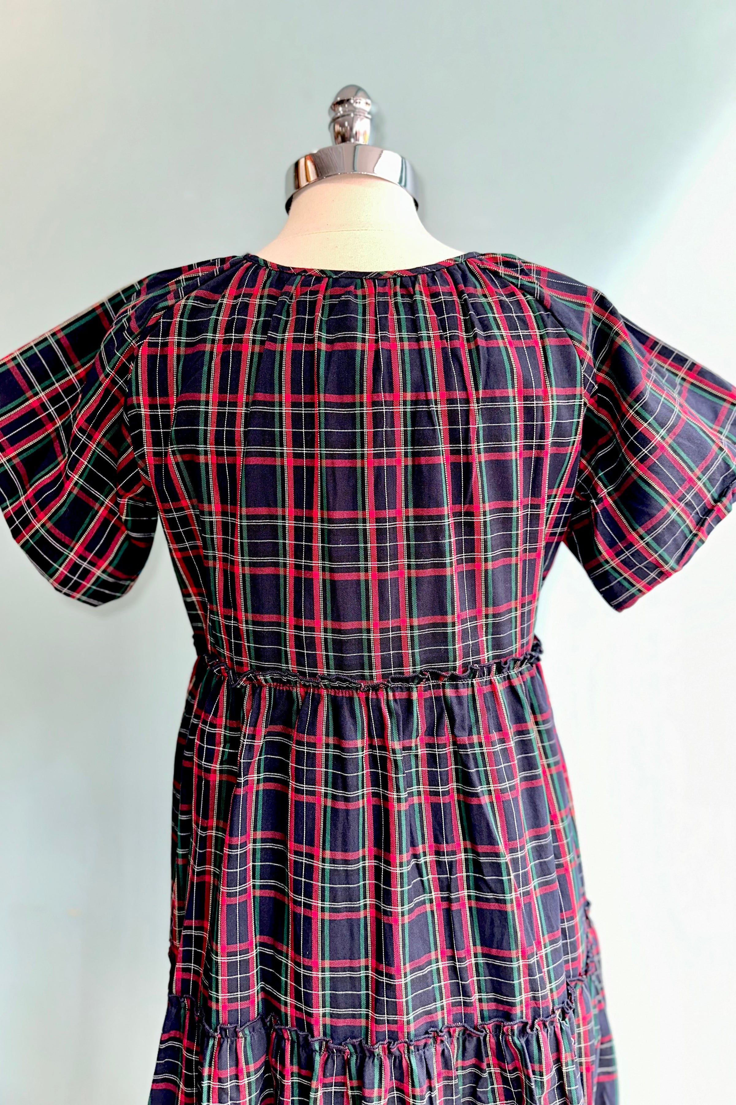 Midi dress in navy plaid with short balloon sleeves and midi length skirt. This is a pullover style with a loose fitting body. This dress is lined and has side pockets.