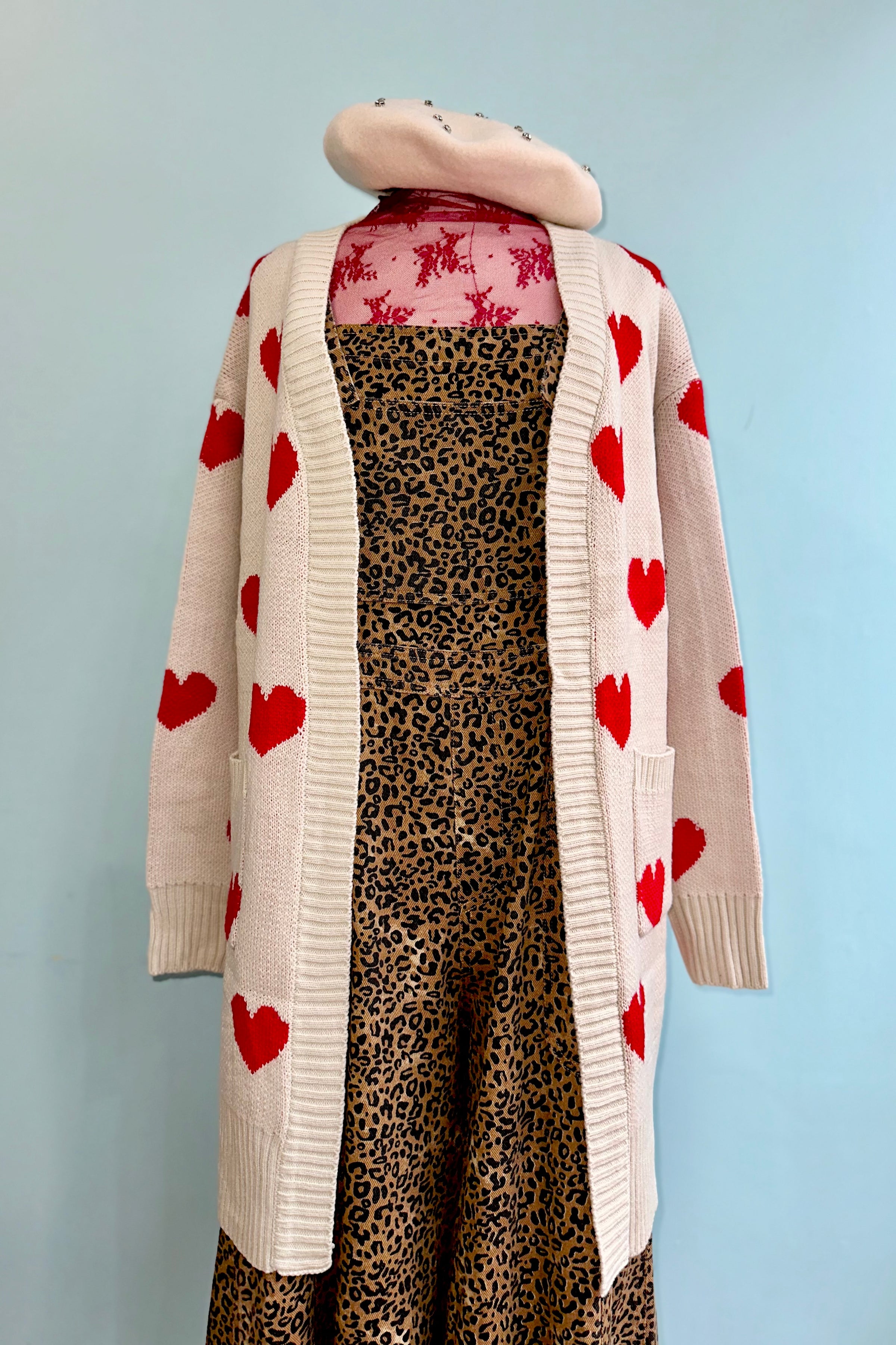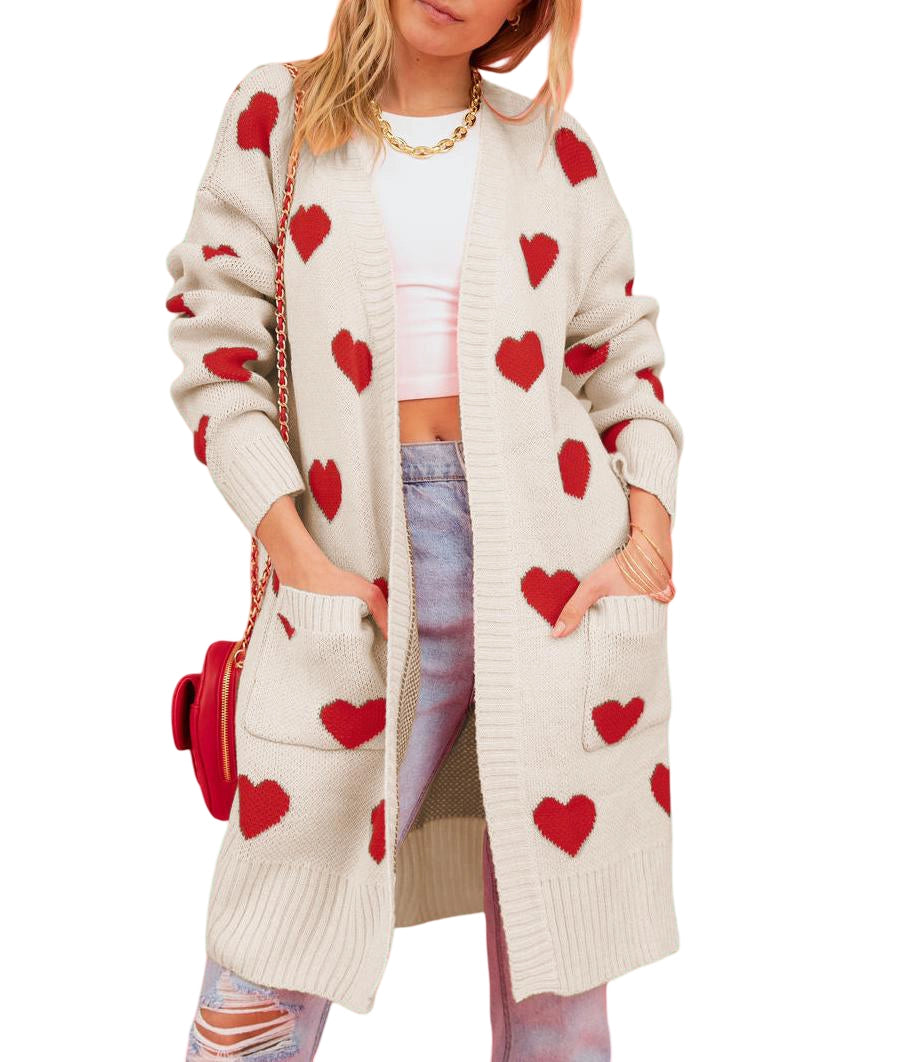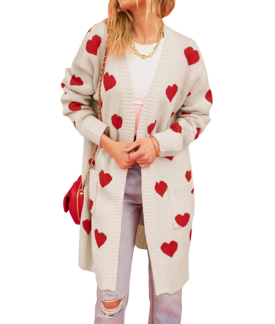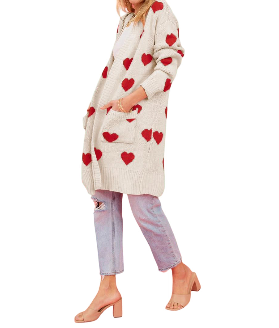 Long open front cardigan in oatmeal with red hearts throughout and front pockets.
