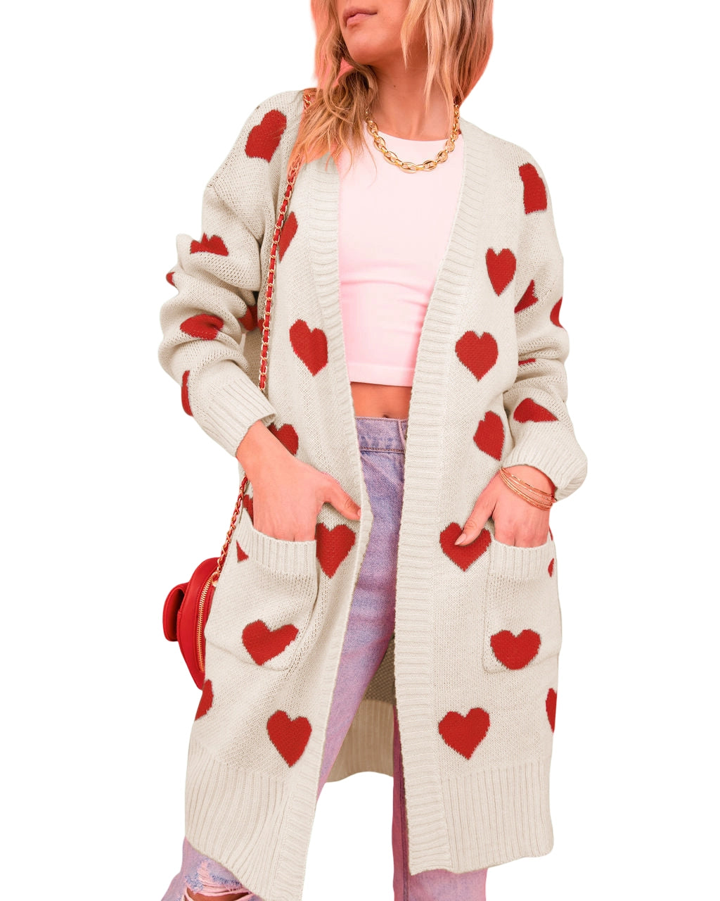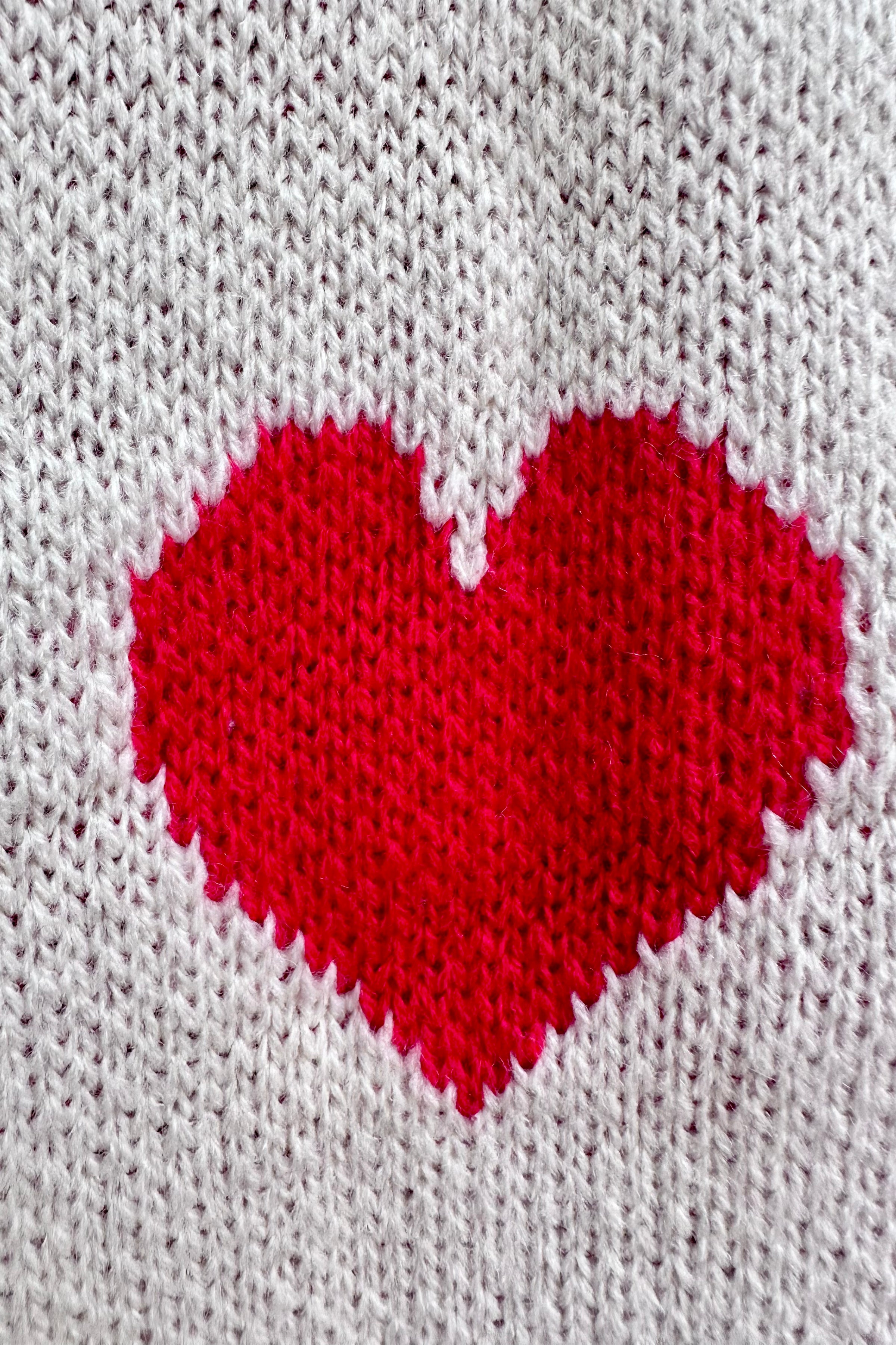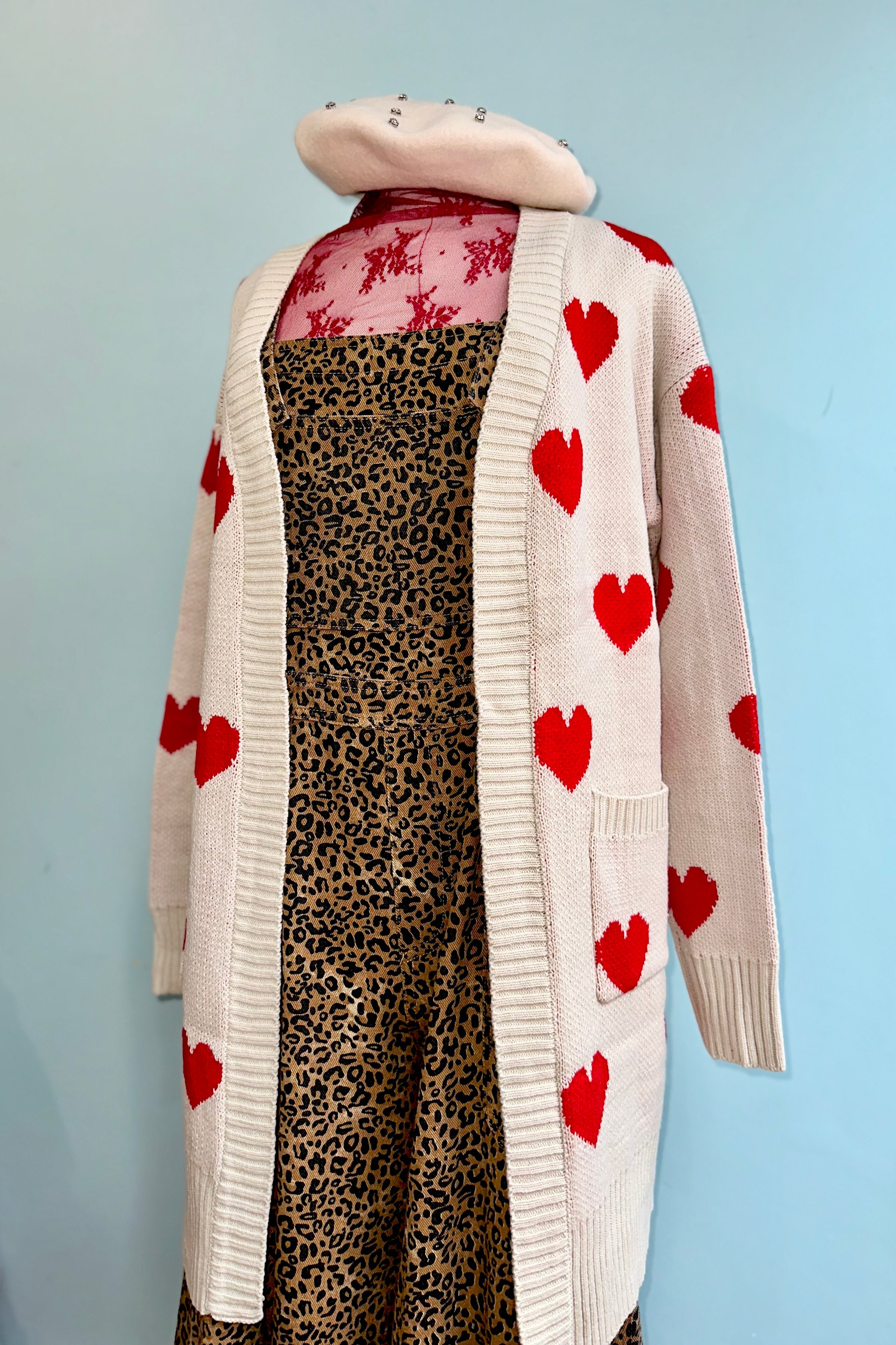 Long open front cardigan in oatmeal with red hearts throughout and front pockets.