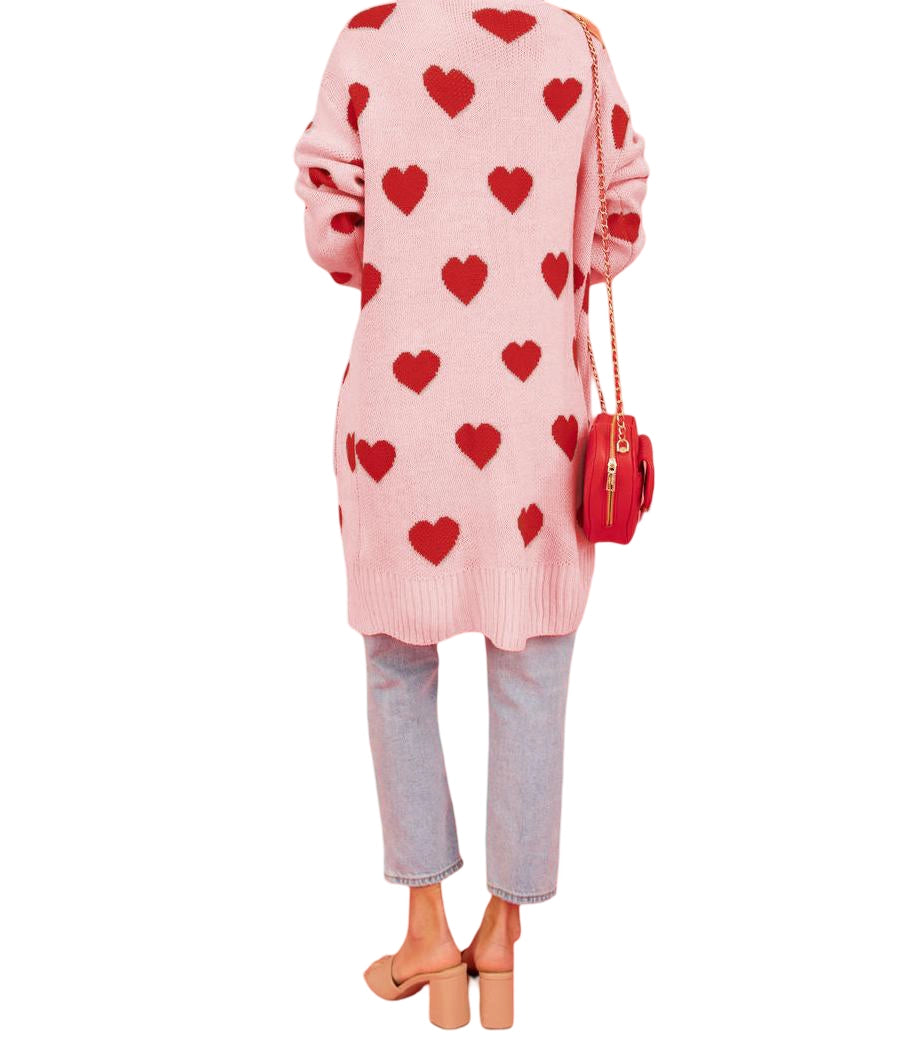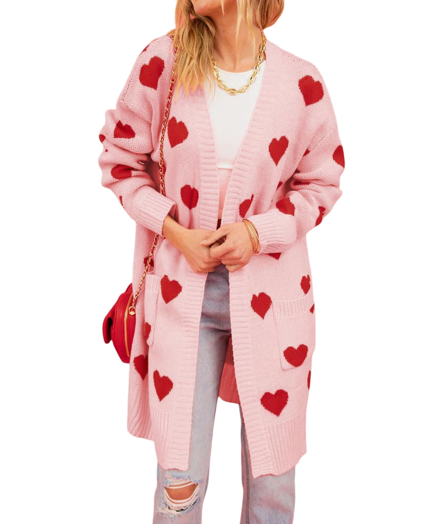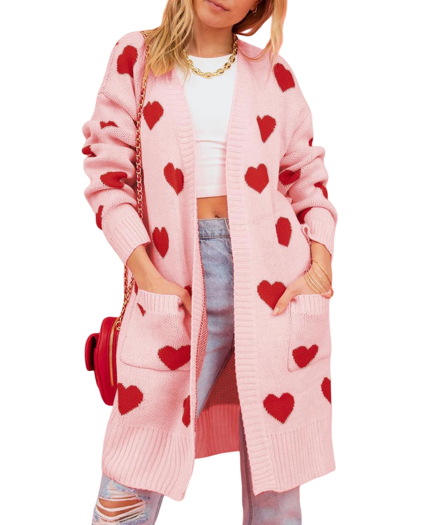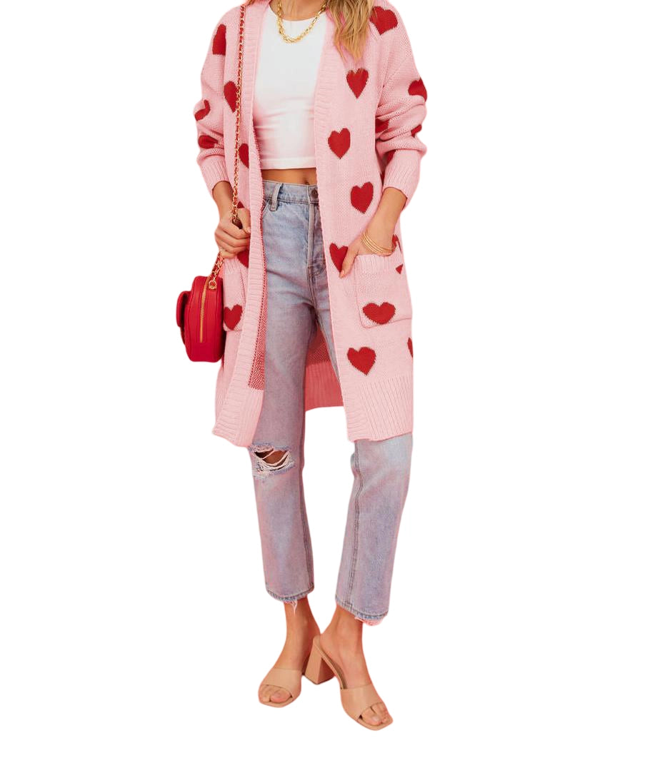 Long open front cardigan in pink with red hearts throughout and front pockets.