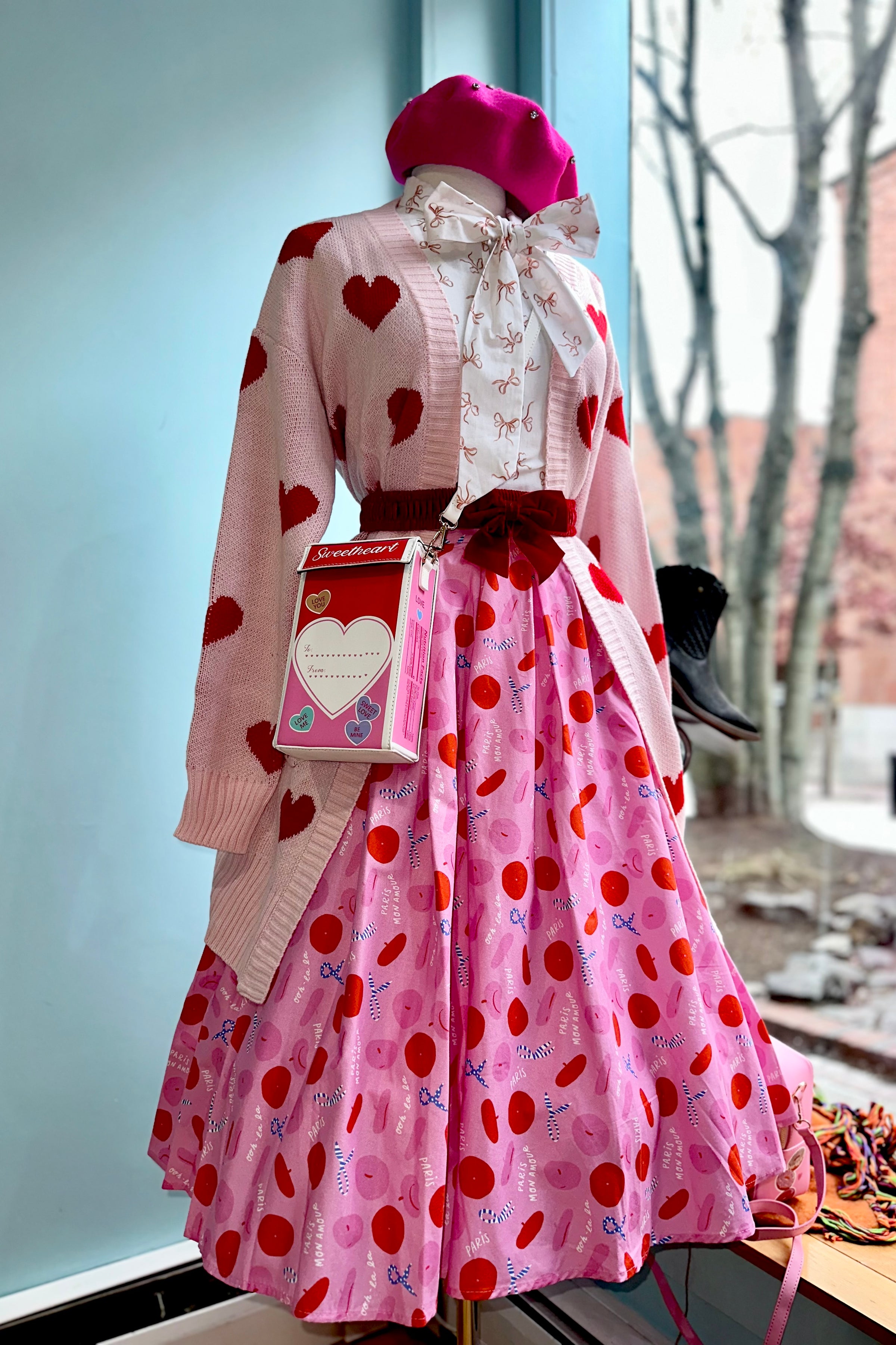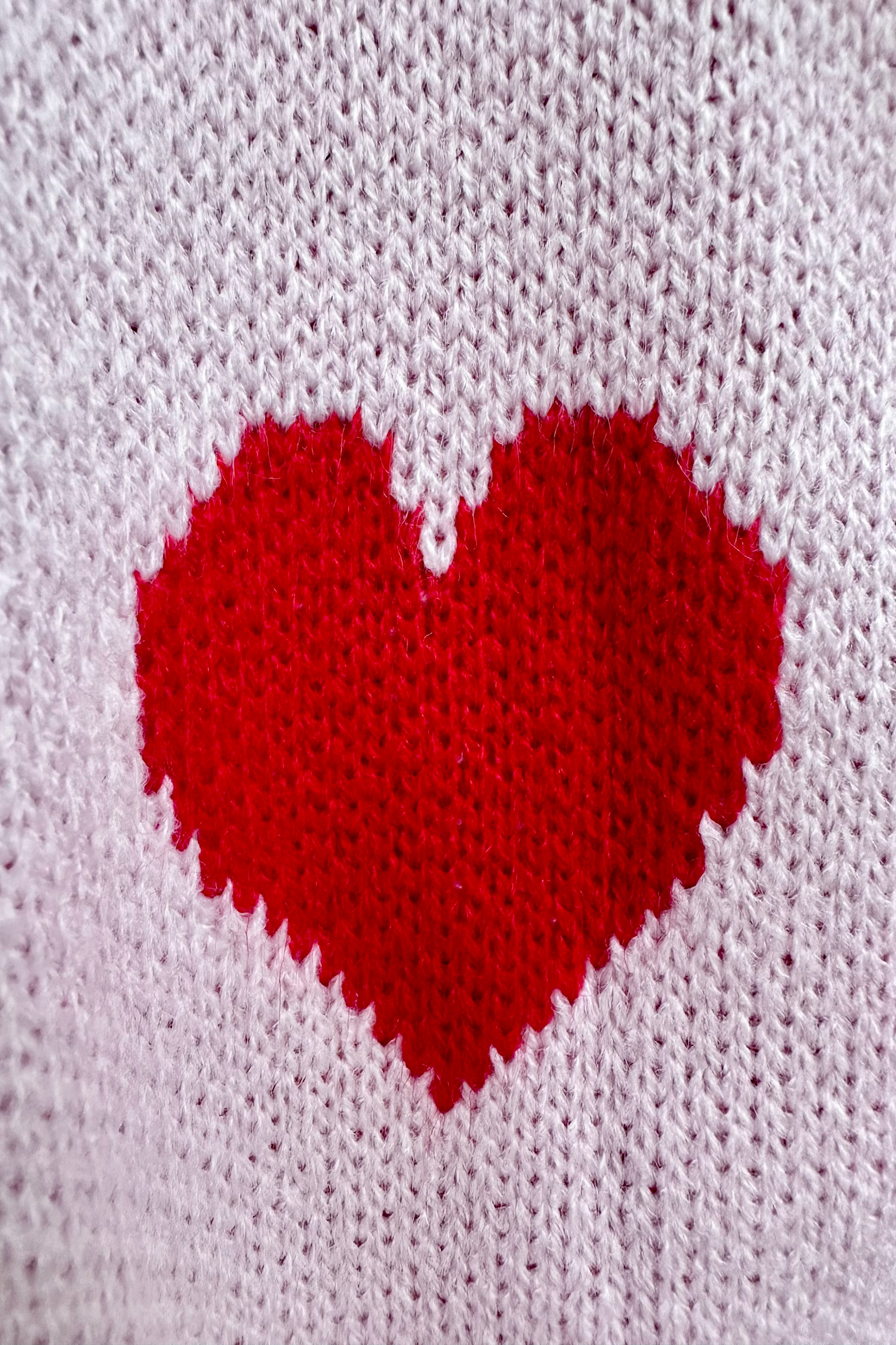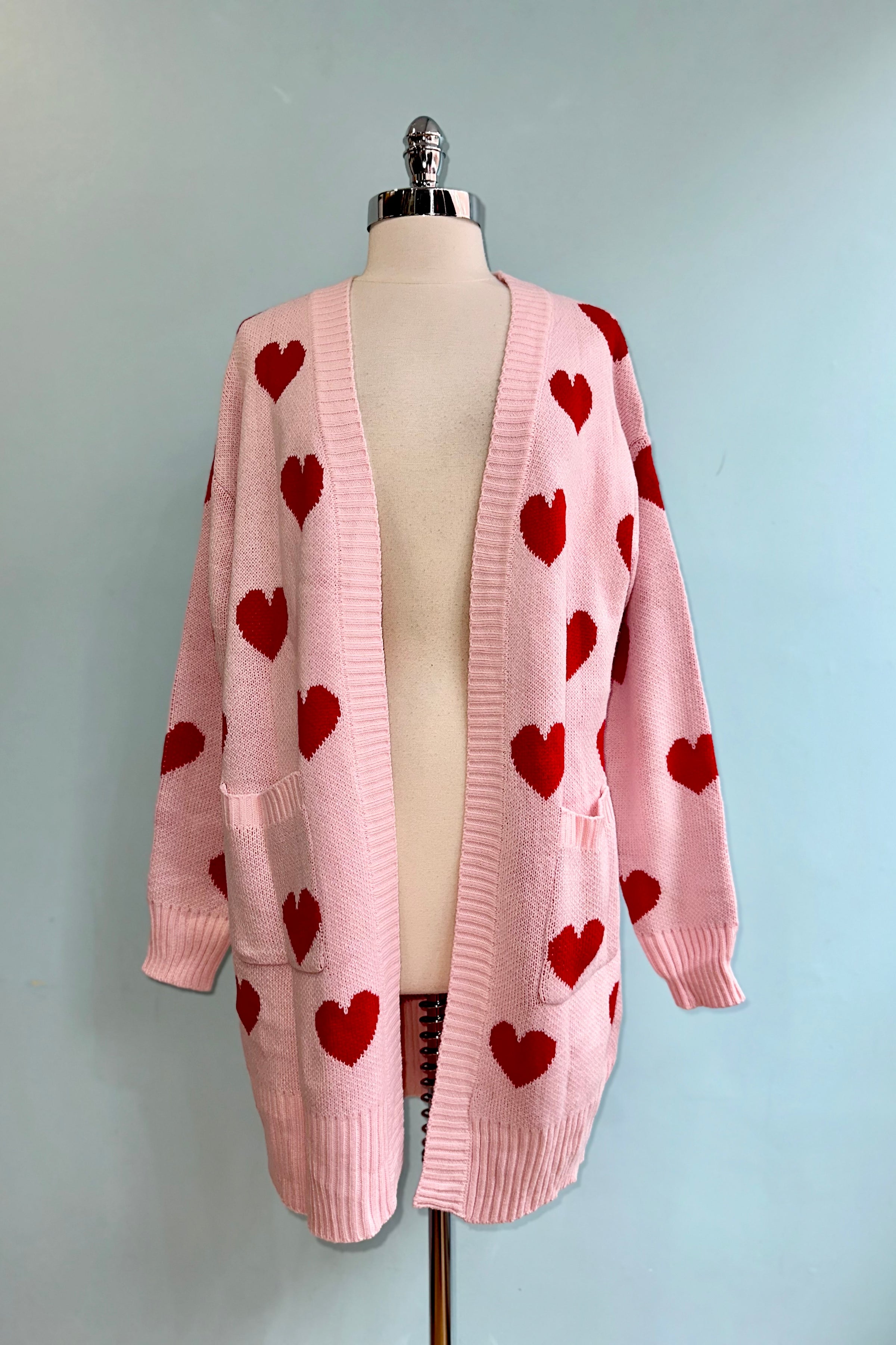 Long open front cardigan in pink with red hearts throughout and front pockets.