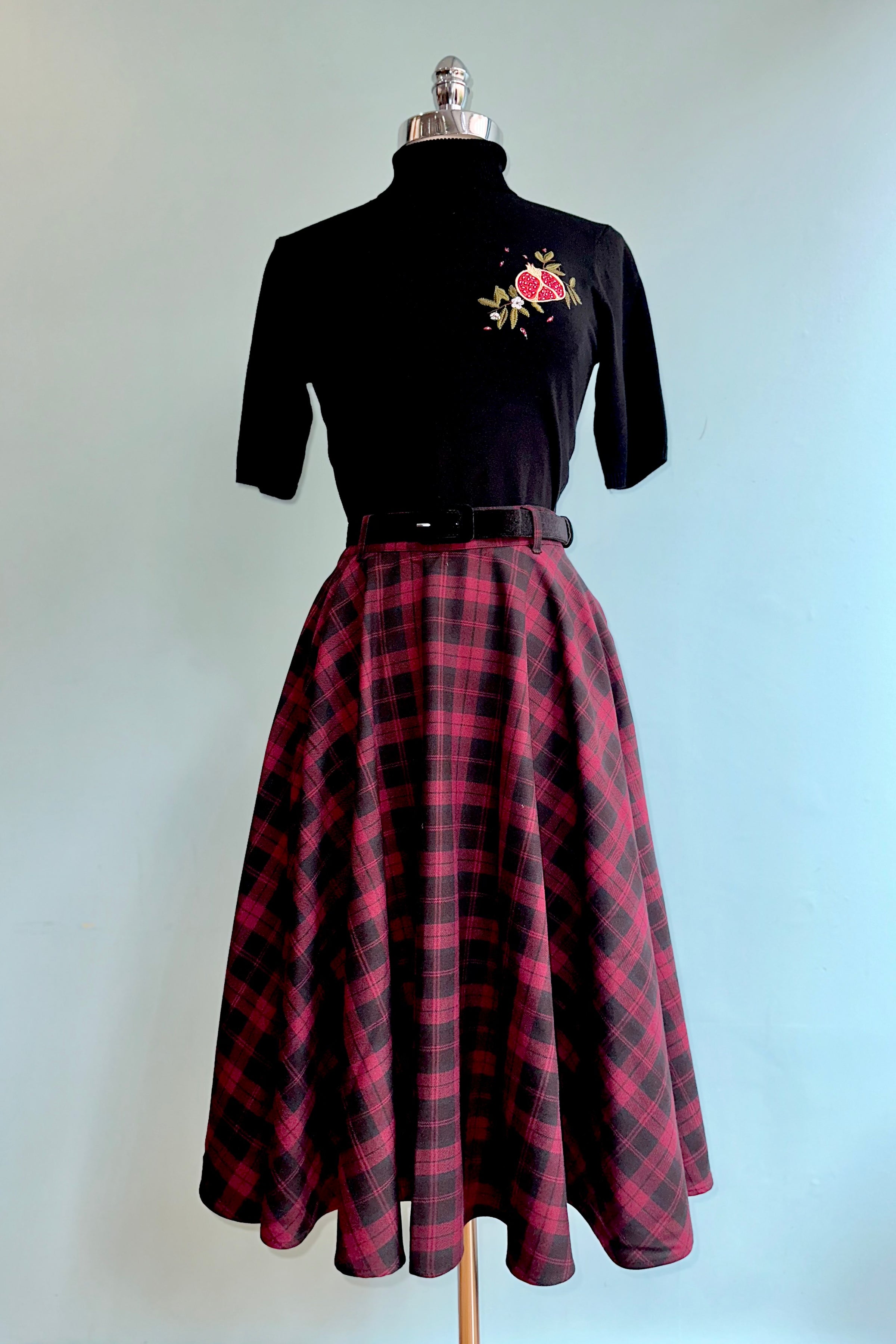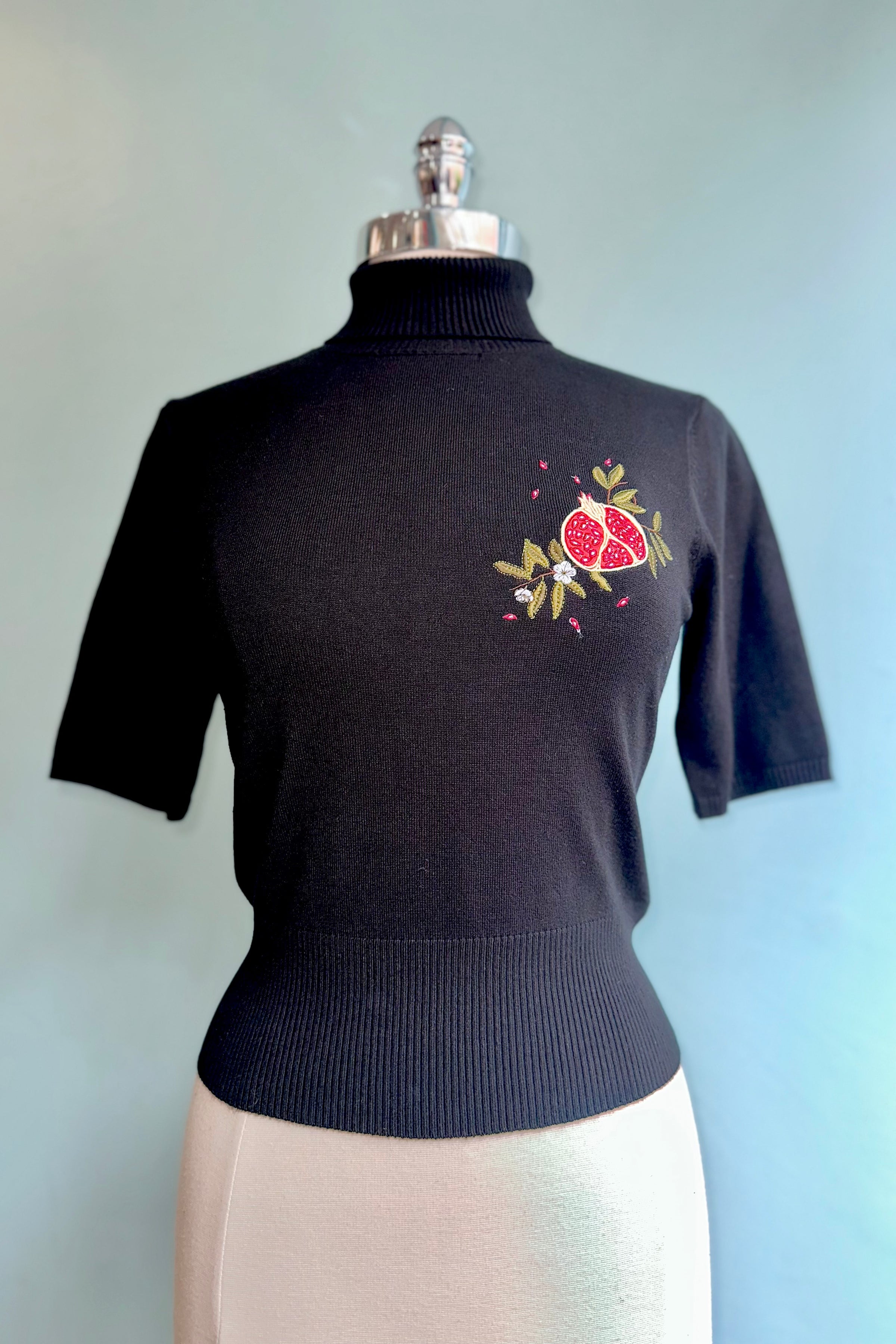 Pullover sweater in black with an embroidered pomegranate on the shoulder.  This sweater has elbow length sleeves and a turtleneck.  Fitted style.