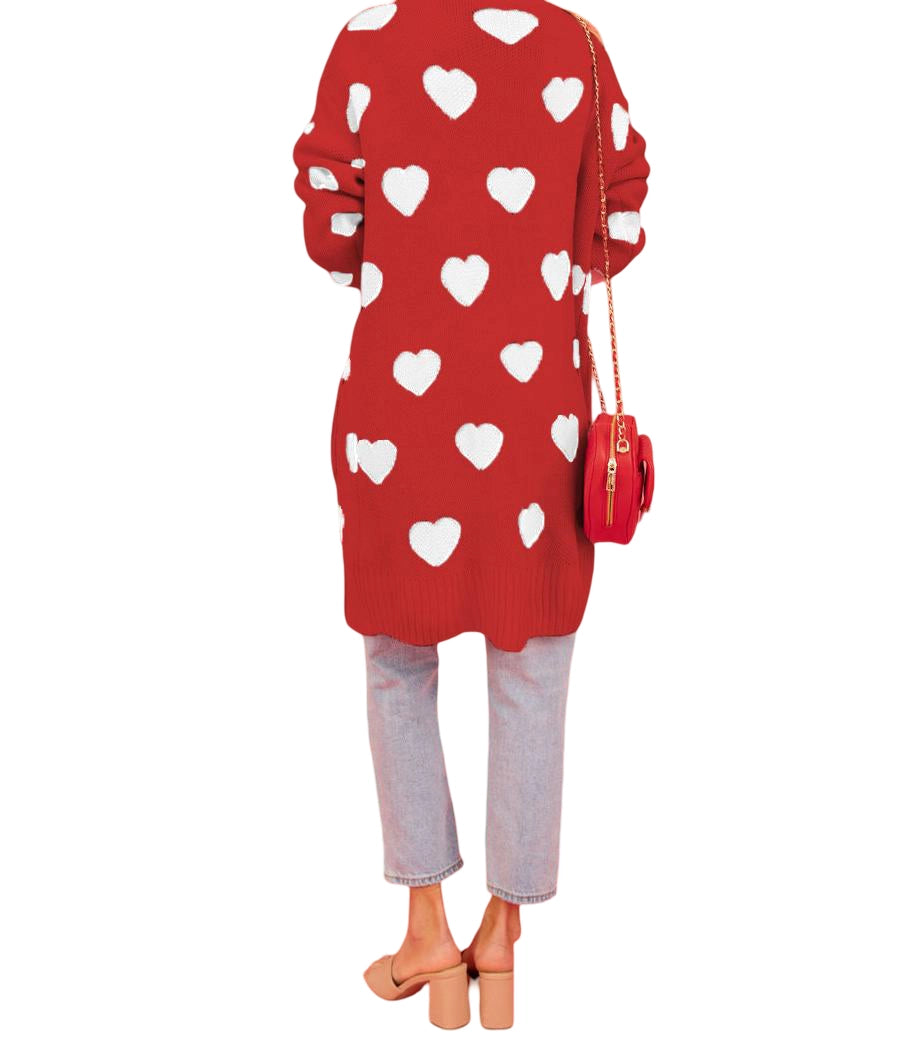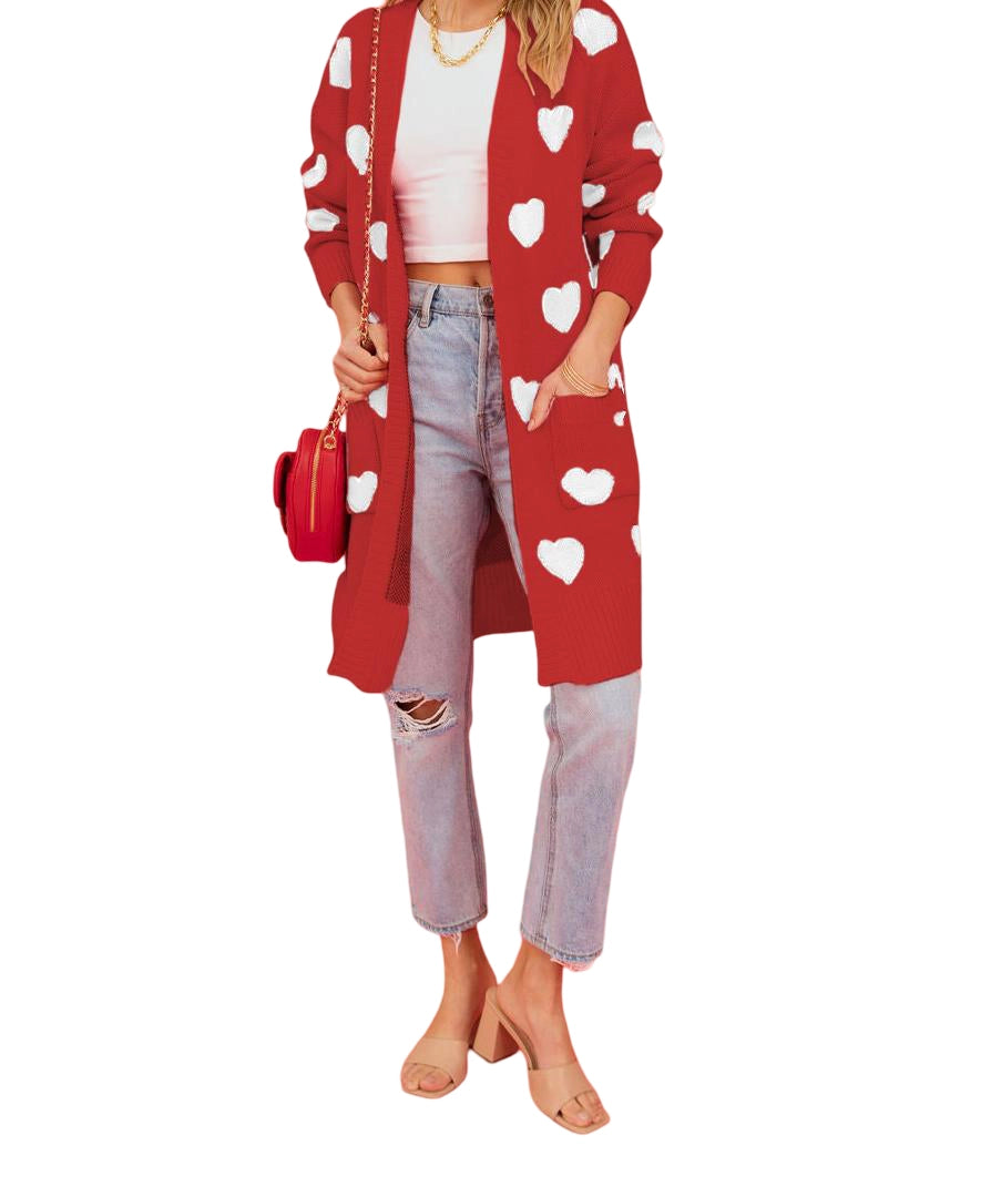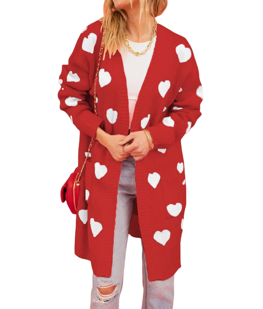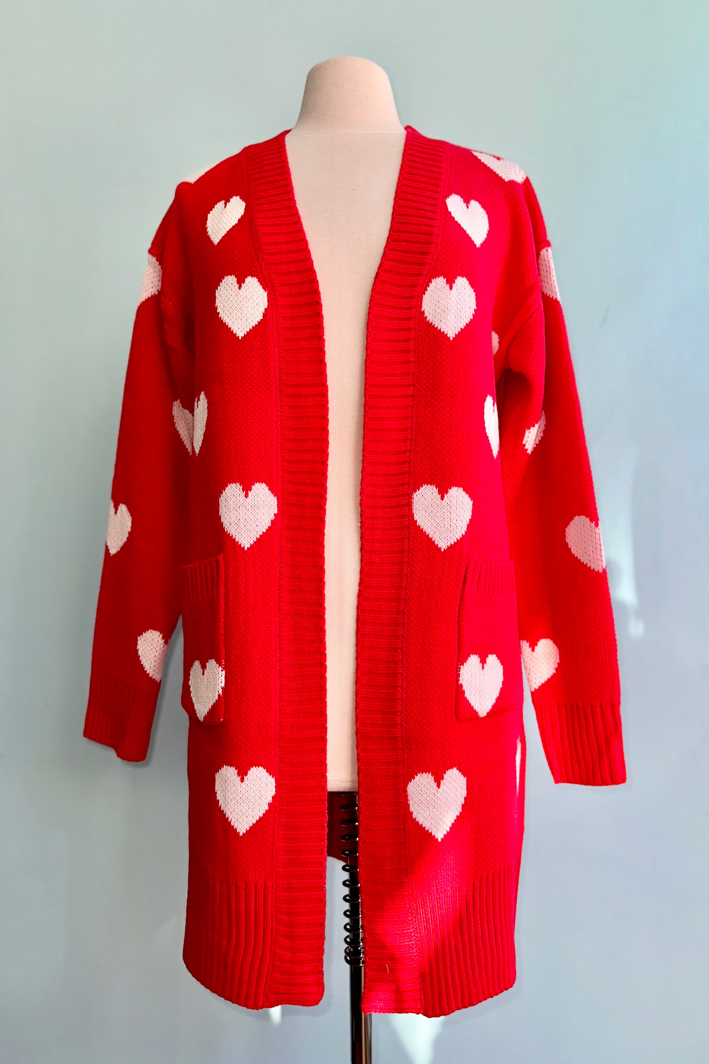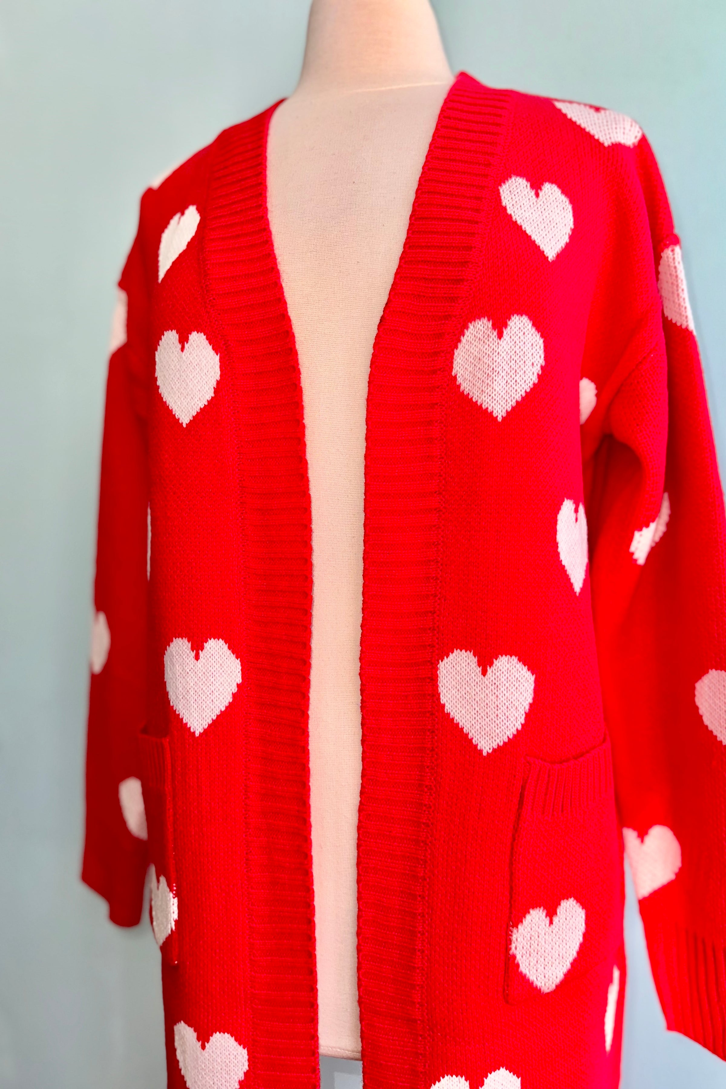 Long open front cardigan in red with white hearts throughout and front pockets.
