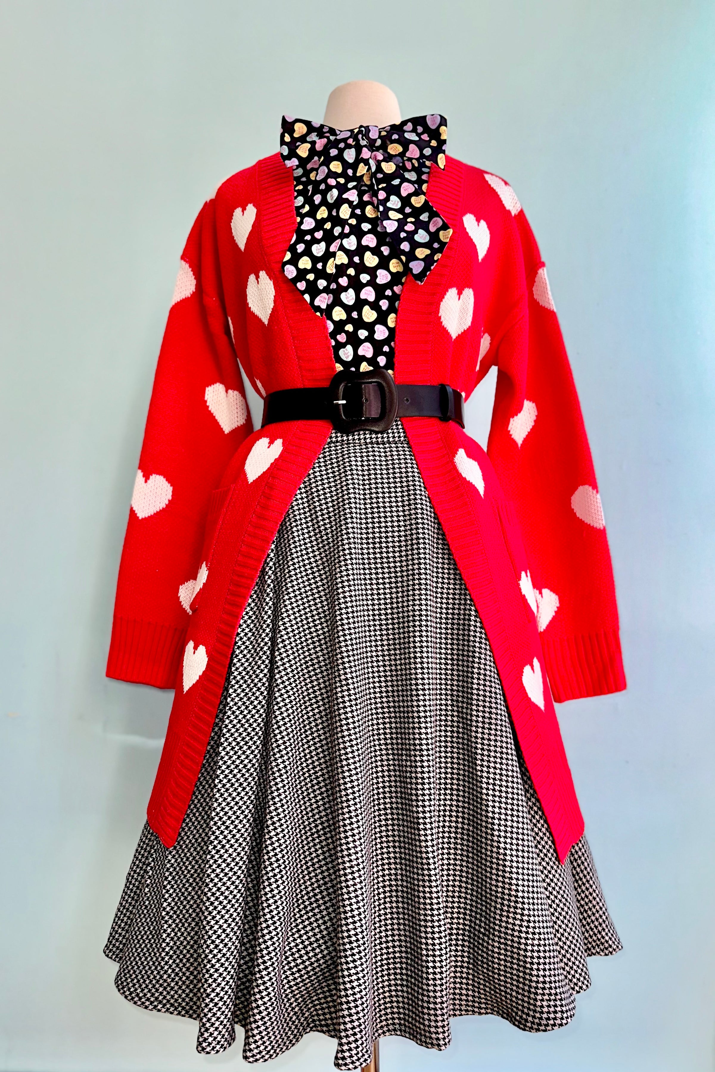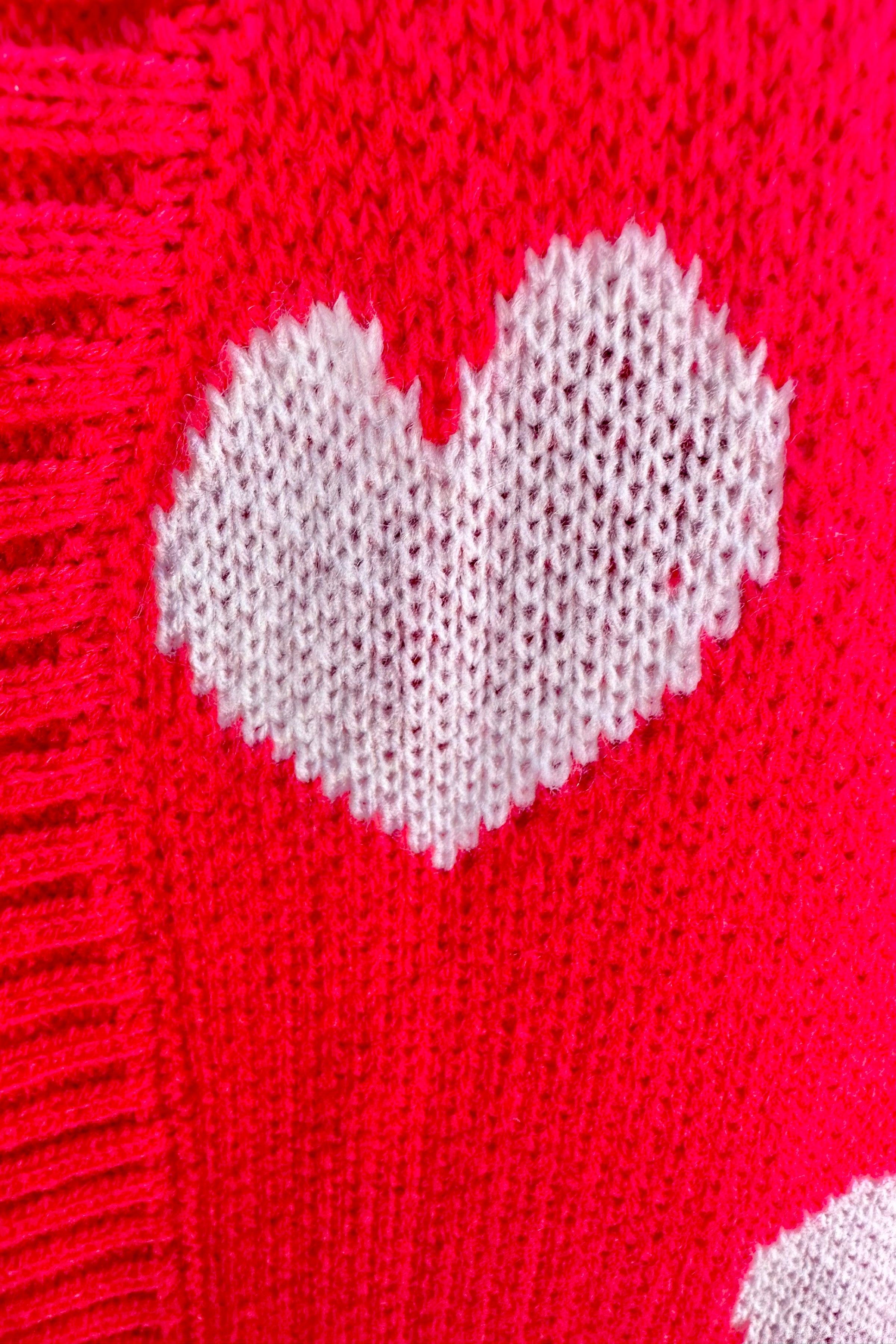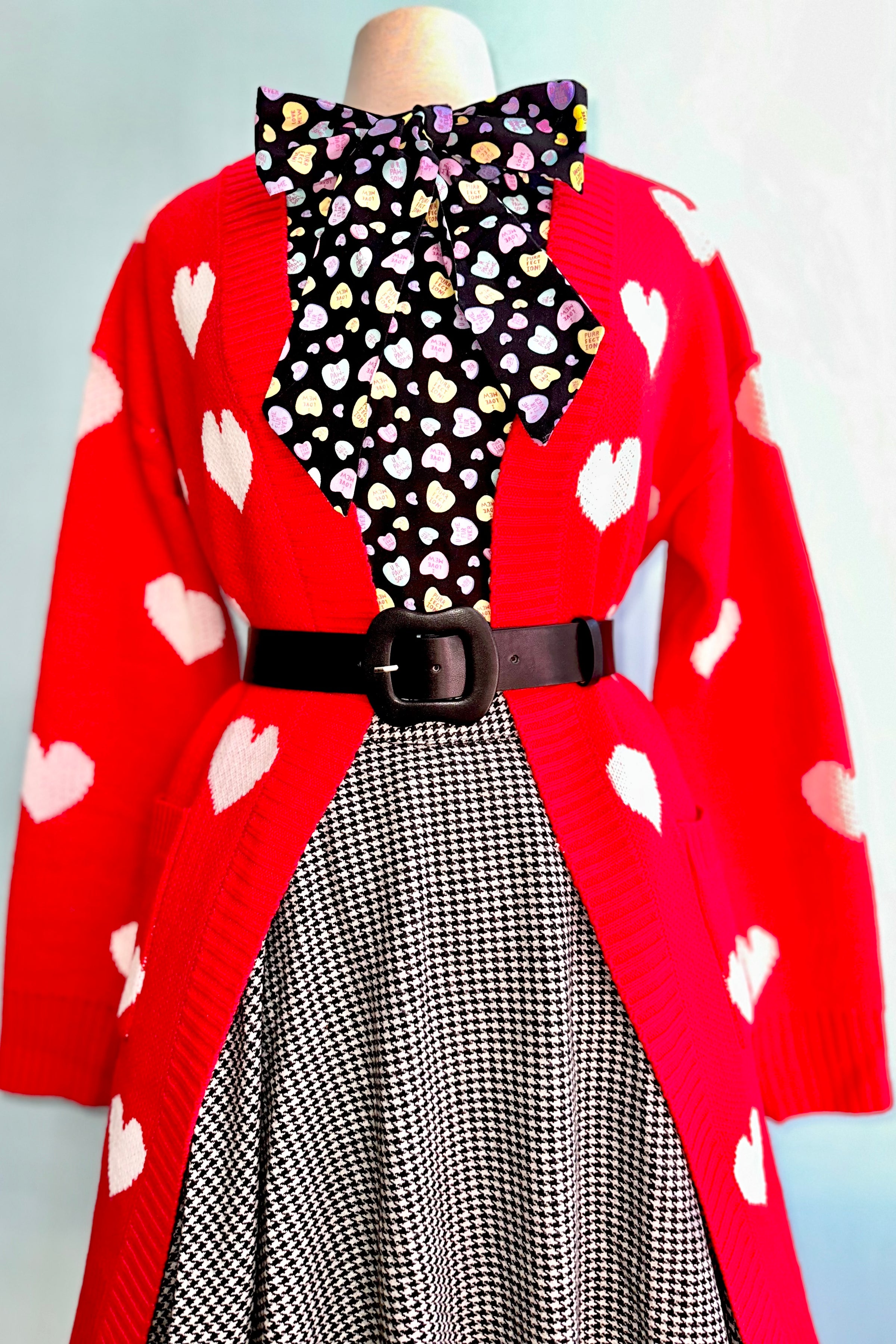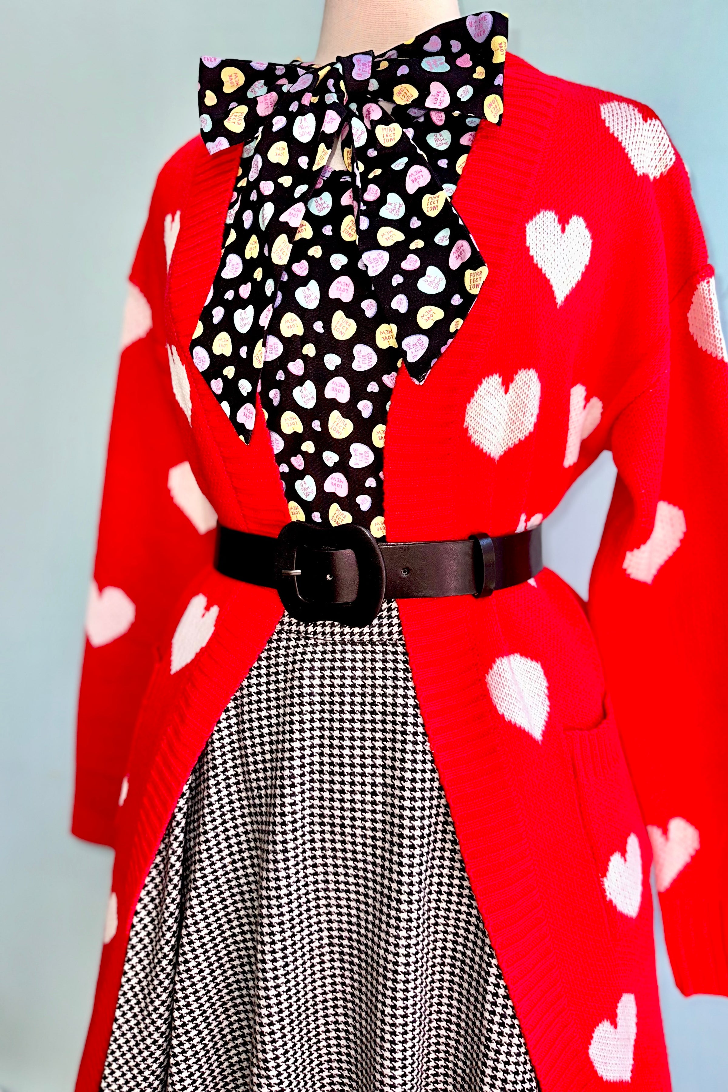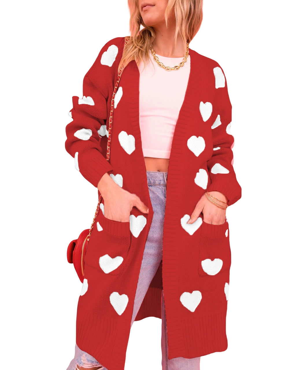 Long open front cardigan in red with white hearts throughout and front pockets.