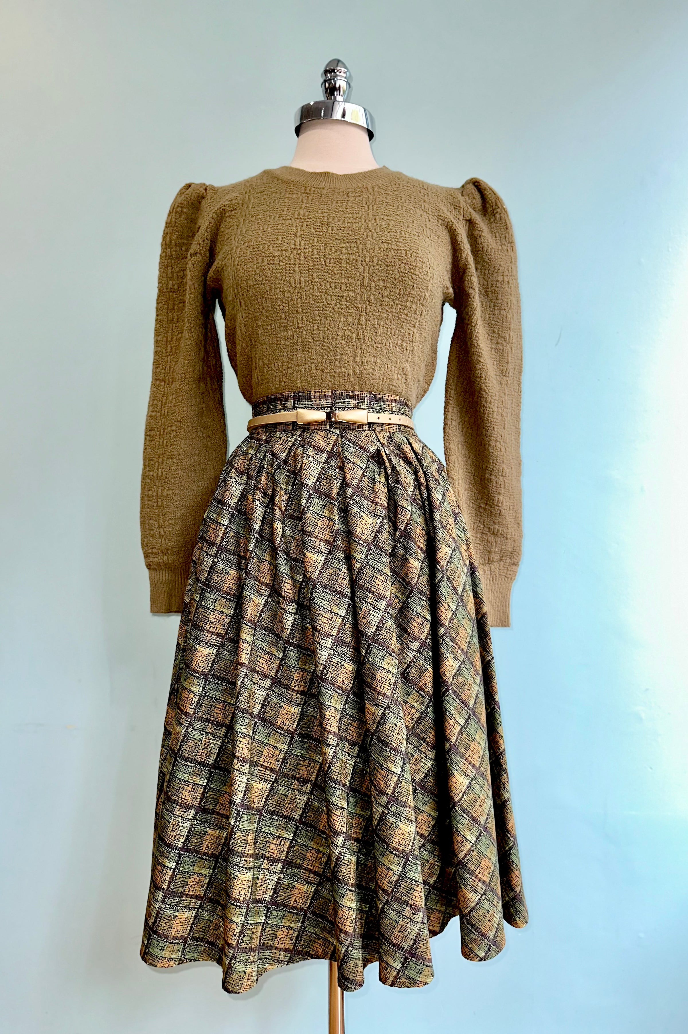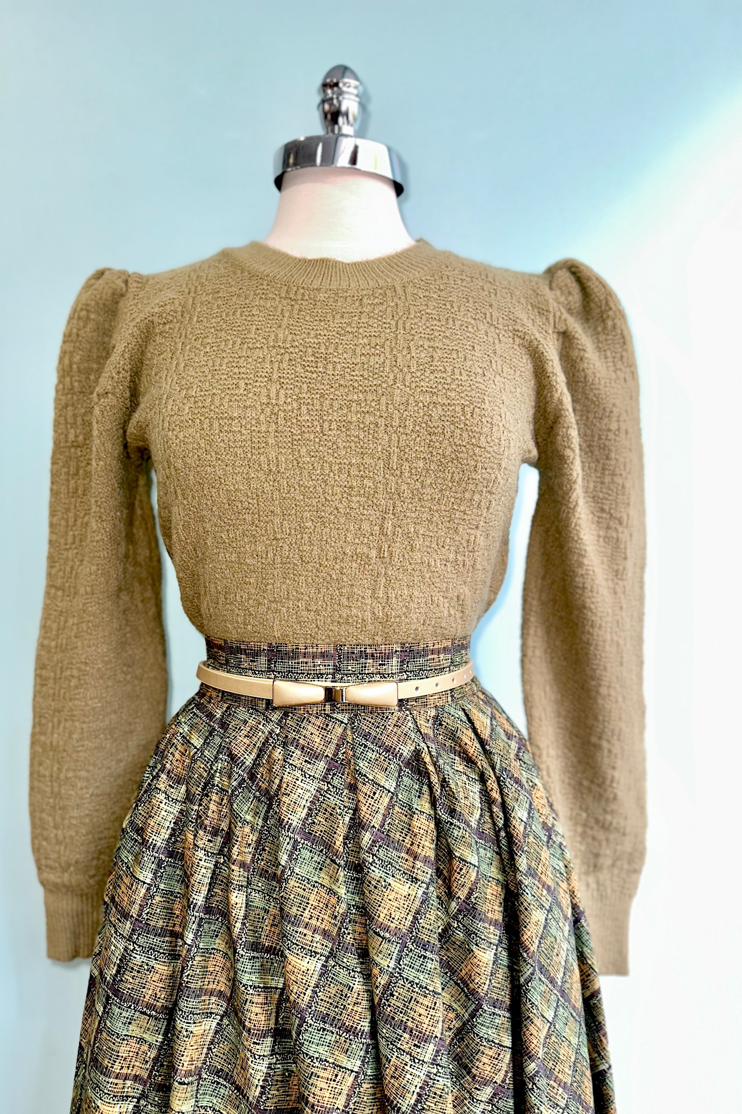 Pullover vintage inspired sweater in Khaki with puff long sleeves, a rounded neck and waist length. This sweater has a ribbed cuff and hem. Very soft!