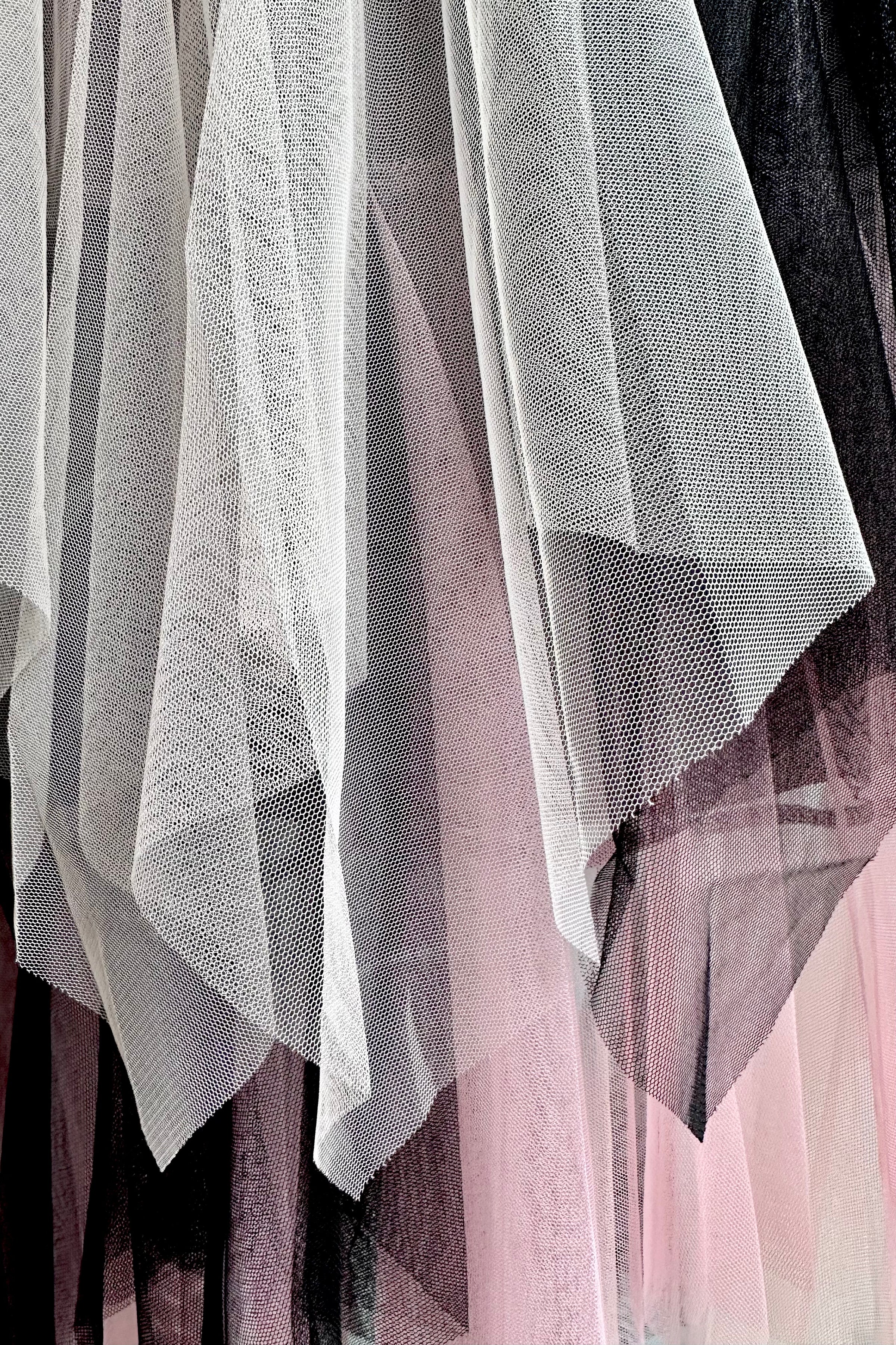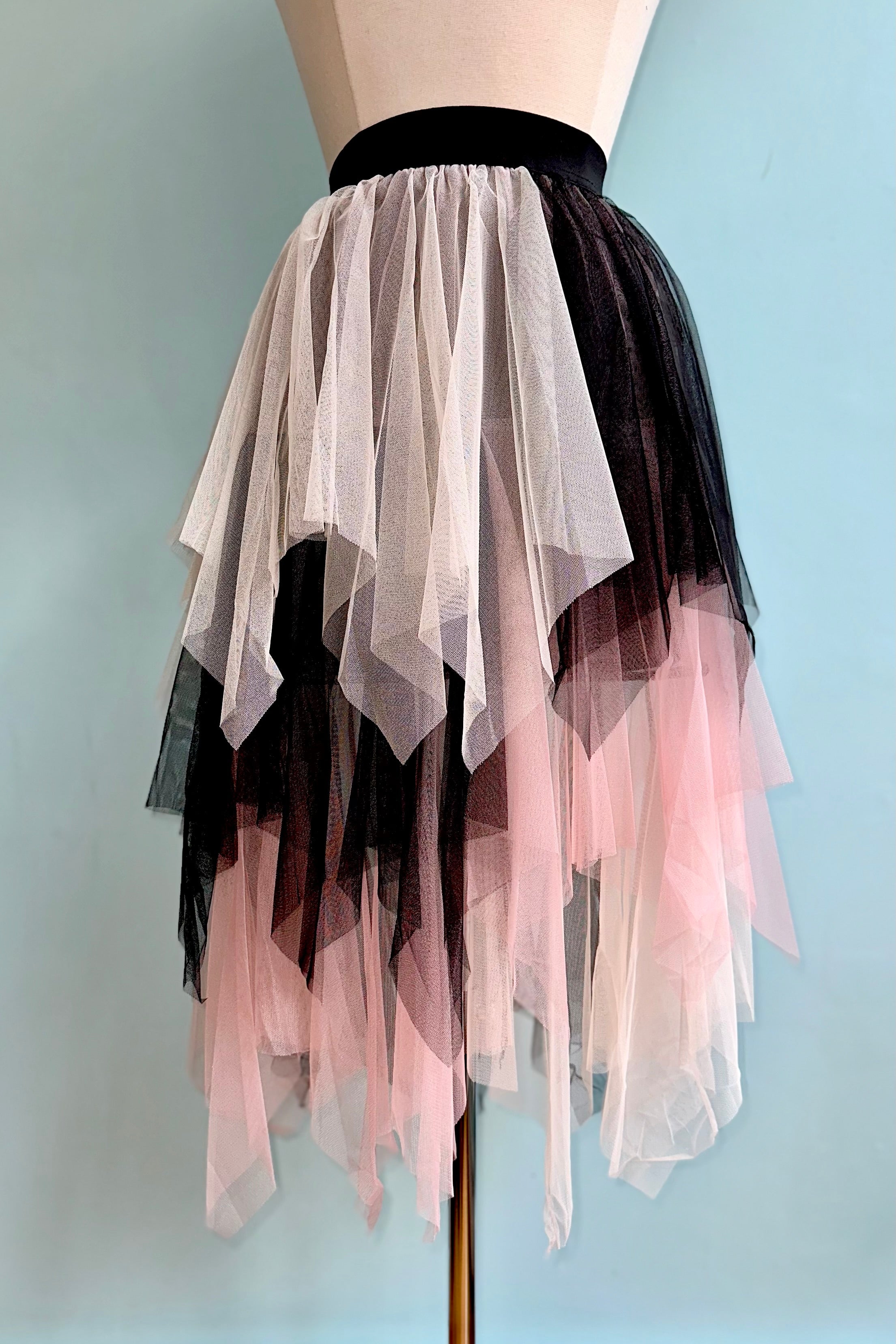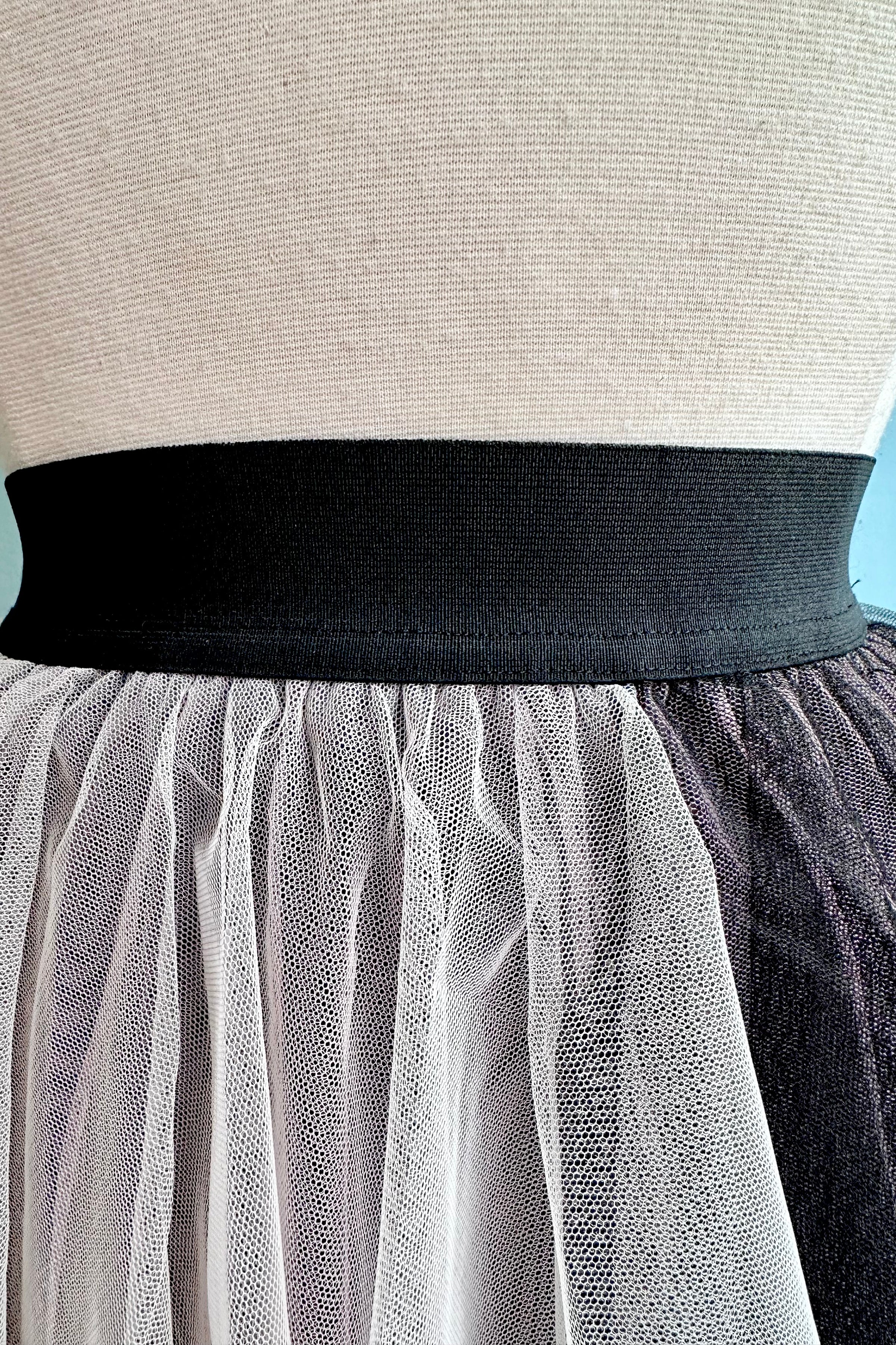 Layered tulle skirt in two colorways. These skirts are one size with a waist flat to fully stretched at 24"-36" with a length of 30". There is a mini skirt lining.